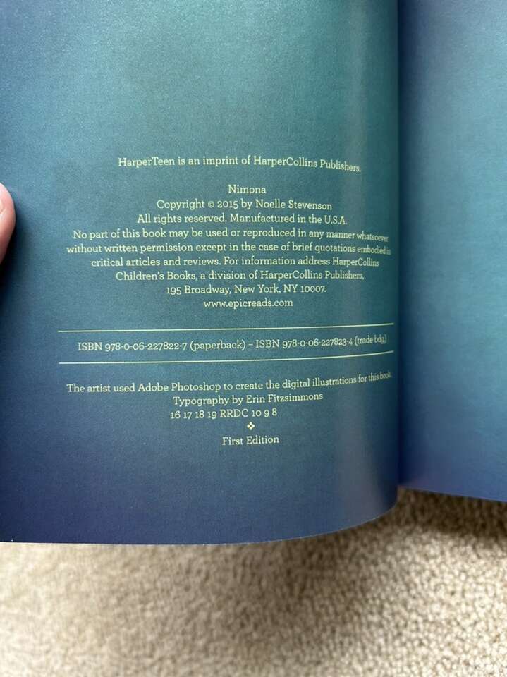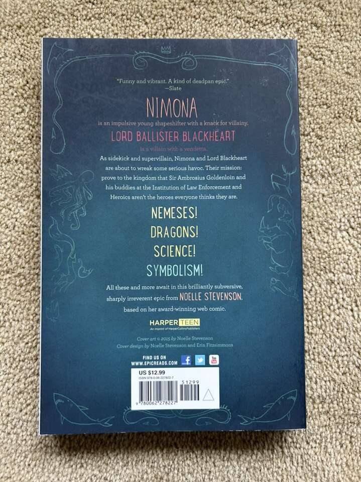 Nimona Graphic Novel, by Noelle Stevenson. Harper Teen 2015, 256 pages. National Book Award Finalist. Sturdy paperback in excellent condition. Text only. Cash or Venmo.