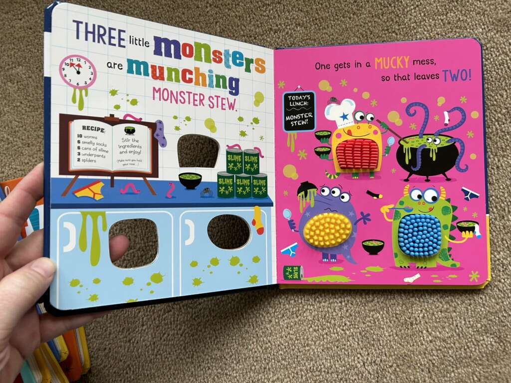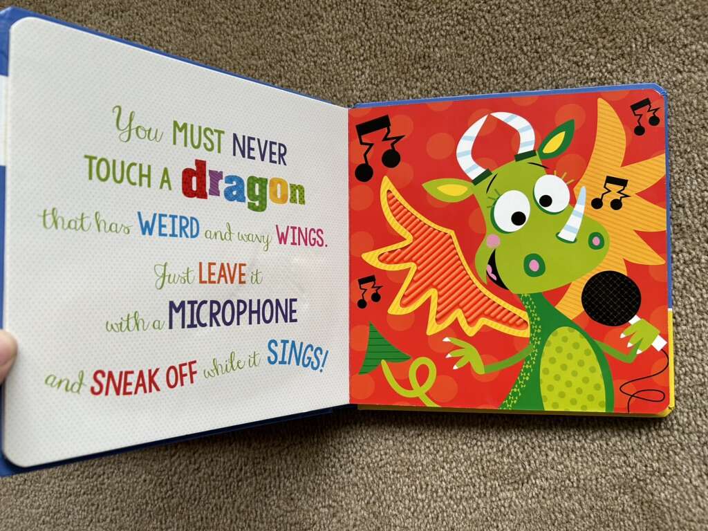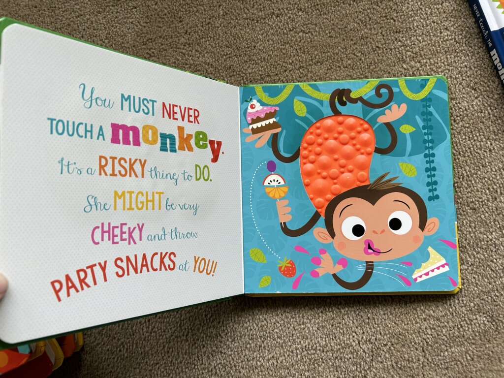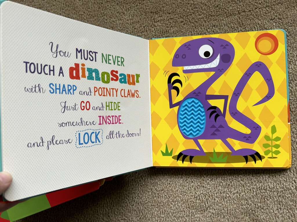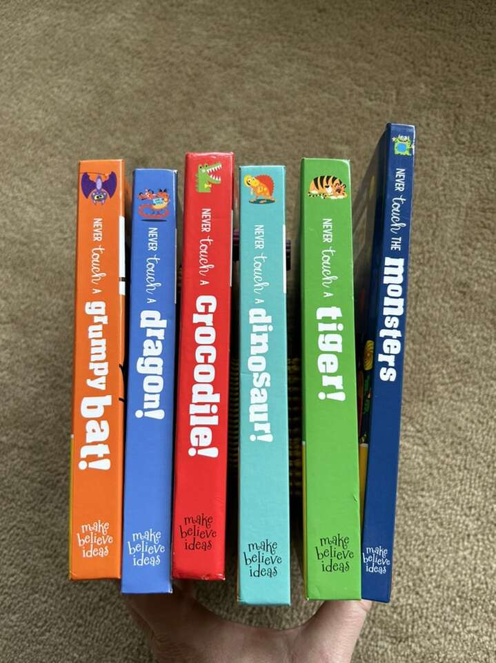 Six “Never Touch a” Board Books, by Stuart Lynch: Never Touch a Grumpy Bat!, Dragon!, Crocodile!, Dinosaur!, Tiger!, and Never Touch the Monsters. Colorful board books full of textured, bumpy spots to feel. Very good condition. Text only. Cash or Venmo.