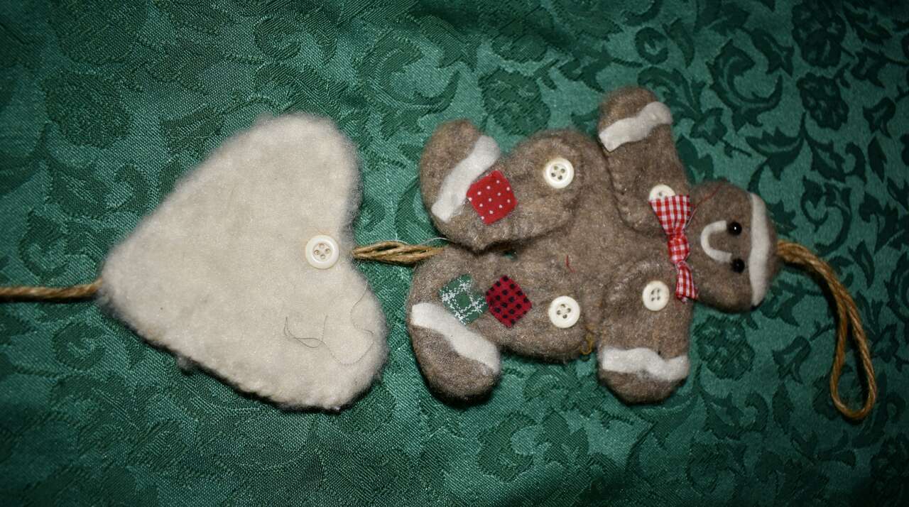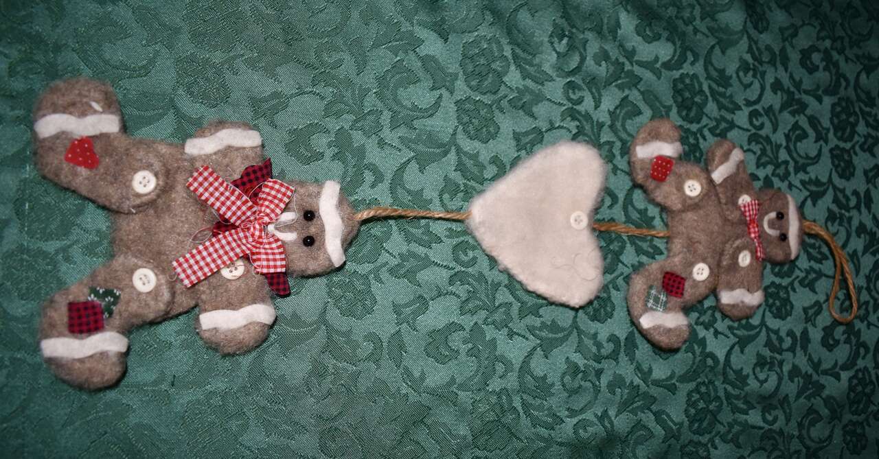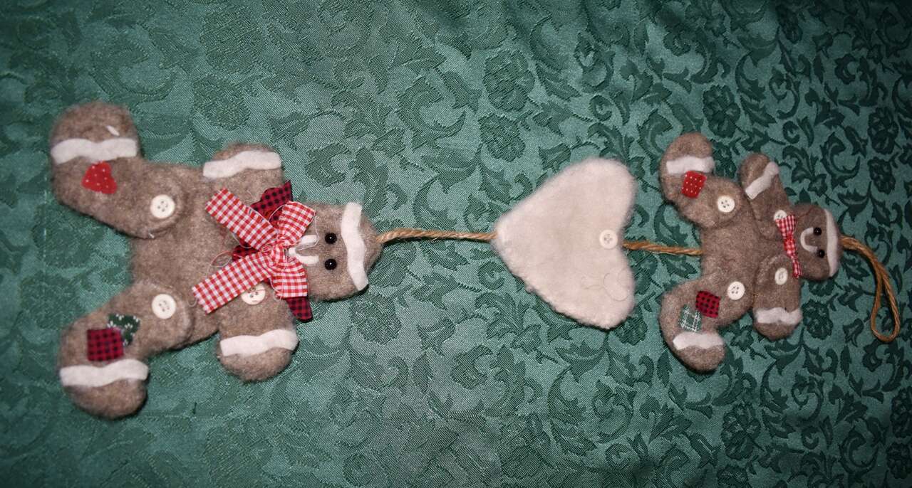 The Gingerbread With A Heart Wall Hanger Measures… Approx. 19 inches tall plus it has a 3 inch piece of jute rope at the top for hanging it onto a wall or a door. Each of the gingerbread men measure…Approx 6 1/2 inches tall and 4 1/2 inches wide and the heart measures… Approx. 3 1/2 inches tall 4 inches wide.