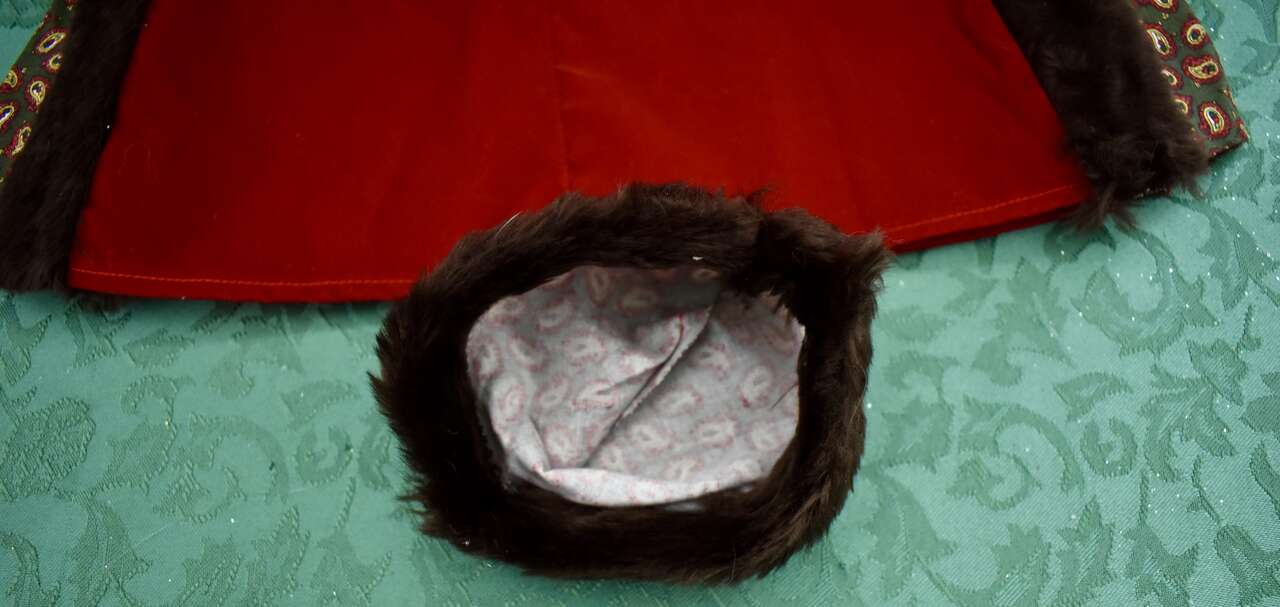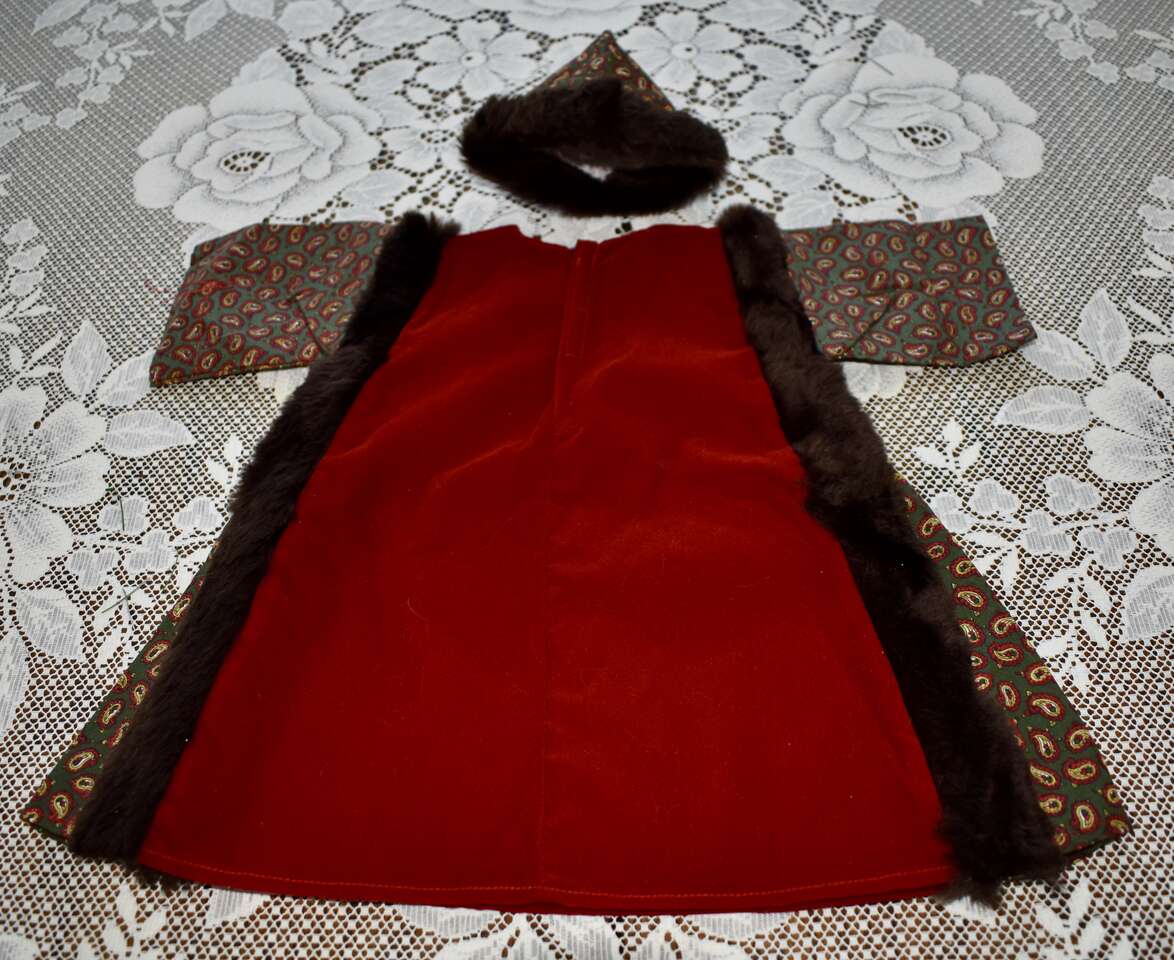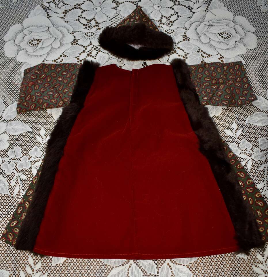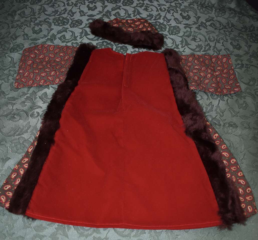 IT MEASURES… APPROX. 13 INHCES LONG MEASURED FROM THE MIDDLE OF THE NECK TO THE BOTTOM OF THE DRESS AREA. IT HAS A VELCRO CLOSING AT THE BACK. IT MEASURES APPROX. 7 1/2 INCHES FROM THE ARM / SHOULDER AREA TO THE BOTTOM OF THE ARM AREA. THE WAIST AREA IS APPROX. 9 1/2 INCHES ACROSS AND YOU CAN PUT A TIE AROUND THAT AREA IF YOU DON’T LIKE IT OPEN AND FLOWING. THE HAT MEASURES.. 12 INCHES AROUND THE BASE WHERE THE BROWN FAUX FUN IS AND IT MEASURES… 3 1/2 INCHES FROM THE TOP TO THE BOTTOM AREA OF THE HAT.