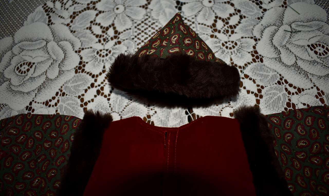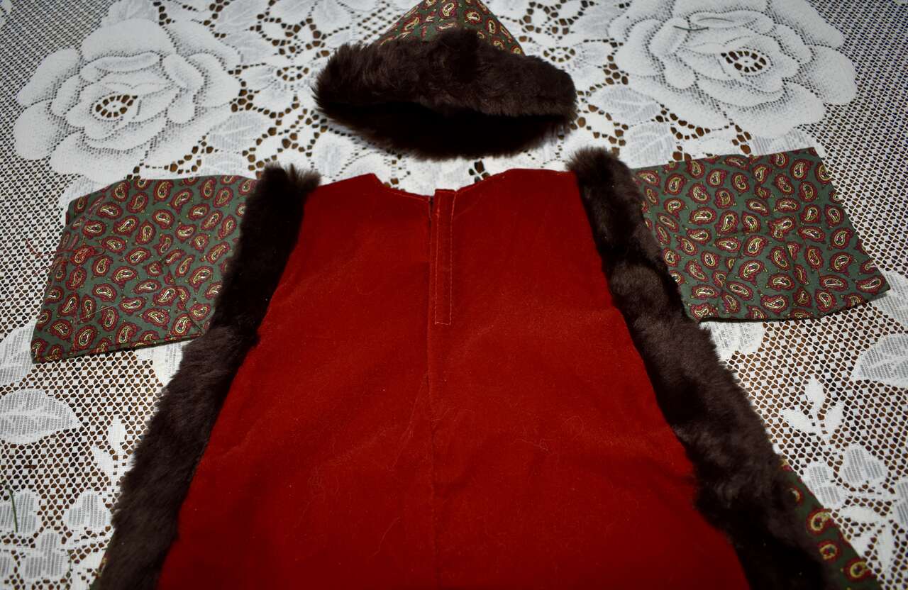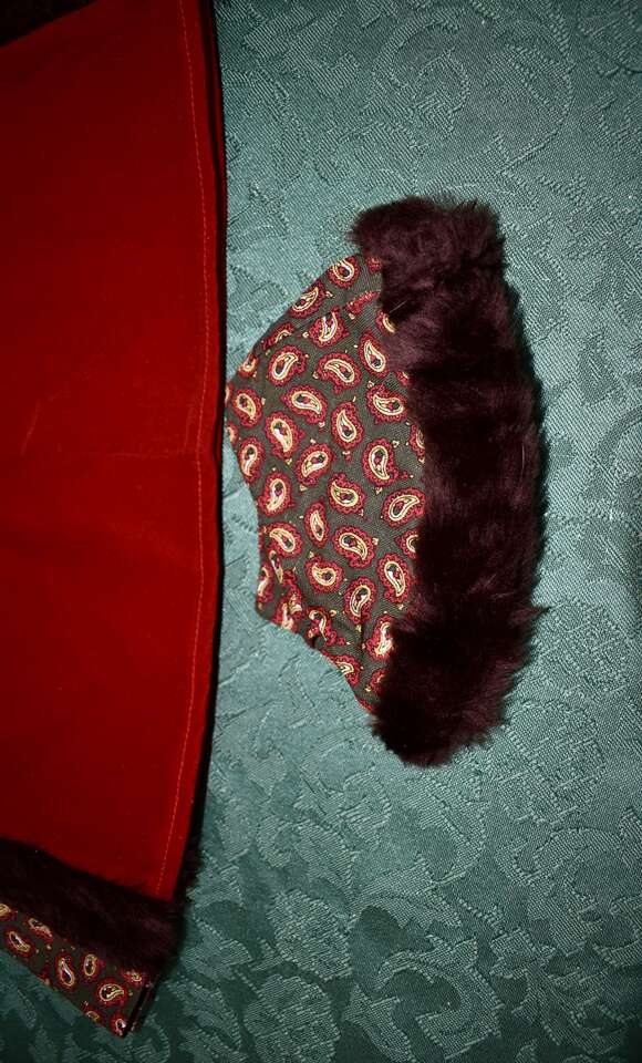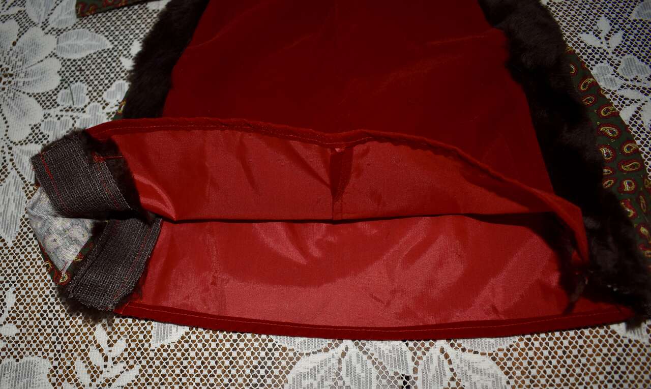 IT MEASURES… APPROX. 13 INHCES LONG MEASURED FROM THE MIDDLE OF THE NECK TO THE BOTTOM OF THE DRESS AREA. IT HAS A VELCRO CLOSING AT THE BACK. IT MEASURES APPROX. 7 1/2 INCHES FROM THE ARM / SHOULDER AREA TO THE BOTTOM OF THE ARM AREA. THE WAIST AREA IS APPROX. 9 1/2 INCHES ACROSS AND YOU CAN PUT A TIE AROUND THAT AREA IF YOU DON’T LIKE IT OPEN AND FLOWING. THE HAT MEASURES.. 12 INCHES AROUND THE BASE WHERE THE BROWN FAUX FUN IS AND IT MEASURES… 3 1/2 INCHES FROM THE TOP TO THE BOTTOM AREA OF THE HAT.