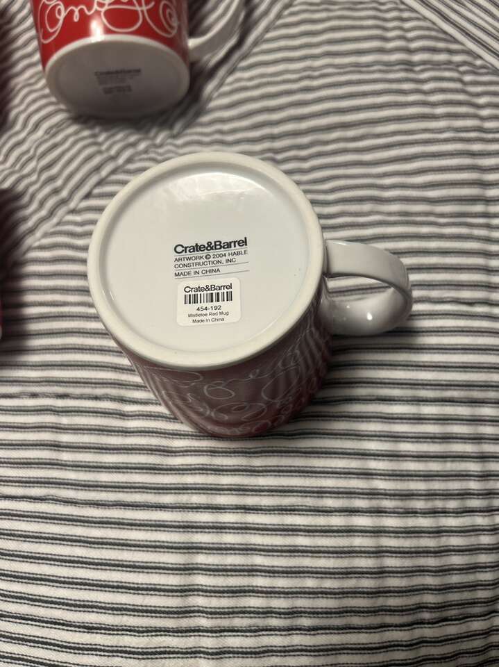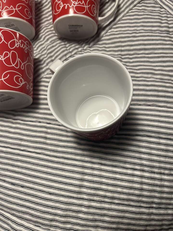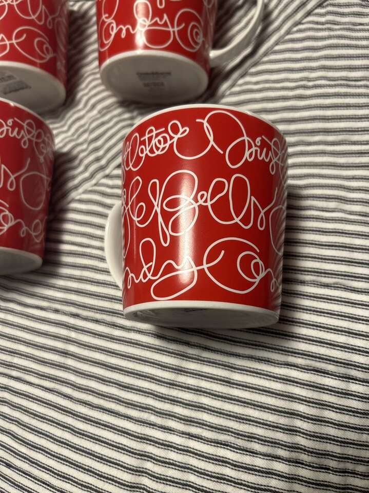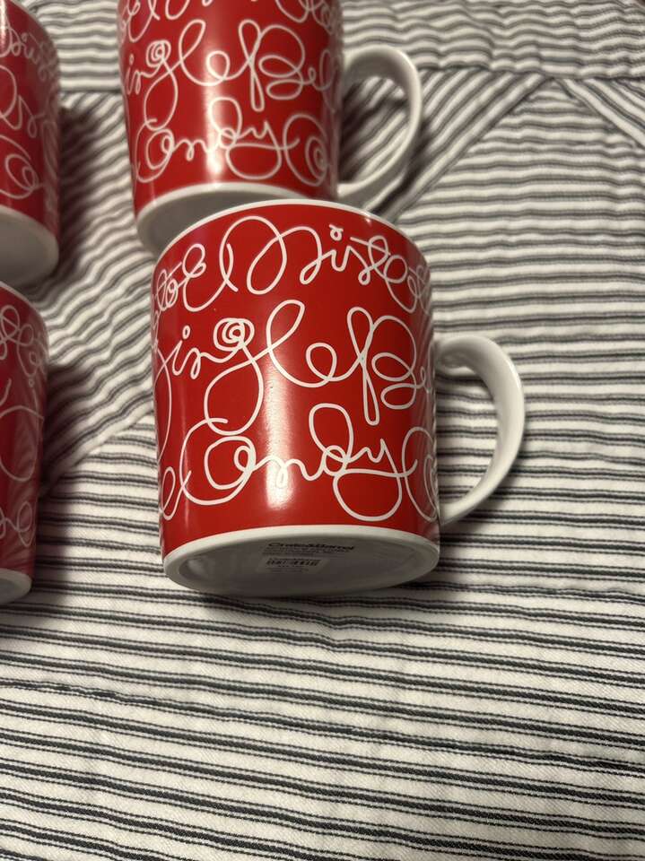 Set of 4 new (never used) holiday mugs - red with write lettering: mistletoe, jingle bells and candycane