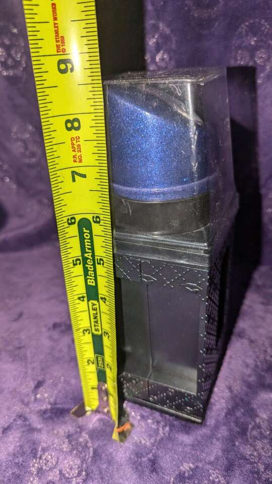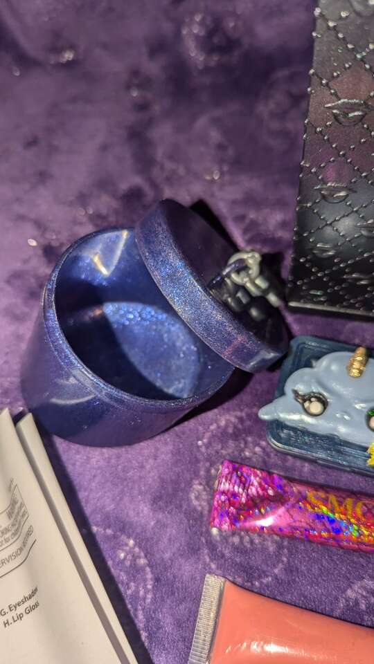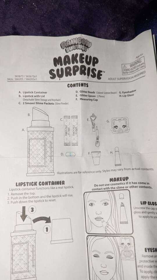 Includes: Black lipstick case Heart Shimmer spoon Sealed lip gloss Measuring cup Blue lipstick keychain slime holder "Stormy Night" eyeshadow slime mix in Checklist Instructions Lid