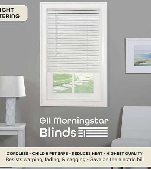 Cordless Light Filtering Mini Blind - 52 Inch Width, 64 Inch Length, 1" Slat Size - Pearl White - Cordless GII Morningstar Horizontal Windows Blinds for Interior by Achim Home Decor