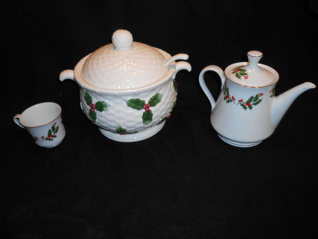 126 PIECE CHRISTMAS CHINA SET, SET INCLUDES THE FOLLOWING: 28 SMALL HOLIDAY JUICE GLASSES, 12 8 OZ. HOLIDAY DRINK GLASSES, 16 STEM HOLIDAY DRINK GLASSES, 15 HOLLY BERRY DINNER PLATES NO GOLD TRIM, 4 MERRY CHRISTMAS DINNER PLATES, 1 HOLIDAY TEA POT, 2 HOLLY BERRY CANDLE HOLDERS, 14 HOLLY BERRY COFFEE CUPS, 12 HOLIDAY PLATES FOR COFFEE CUPS, 12 HOLLY BERRY SOUP/SALAD BOWLS, 9 HOLIDAY DESSERT CUPS, 1 HOLIDAY SOUP TUREEN. CASH ONLY FOR CHRISTMAS CHINA SET, SERIOUS BUYERS ONLY