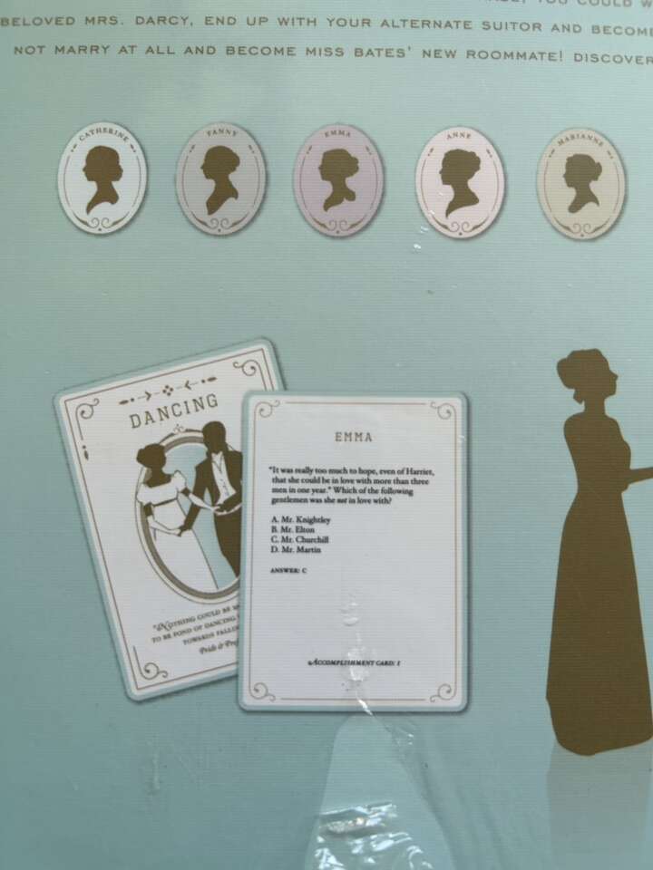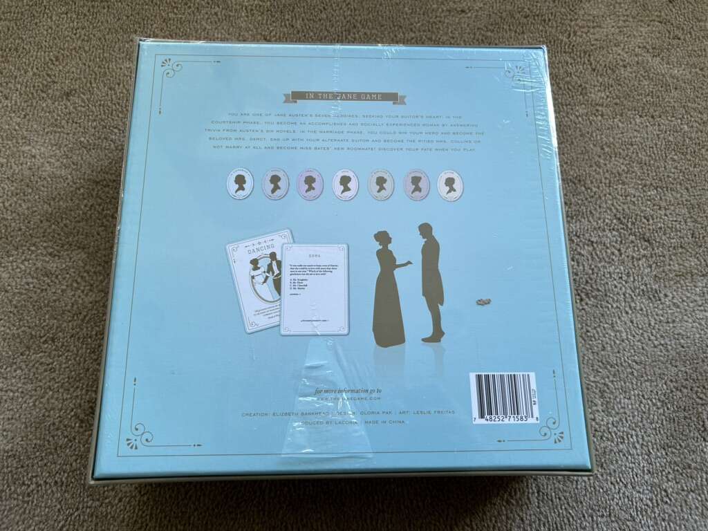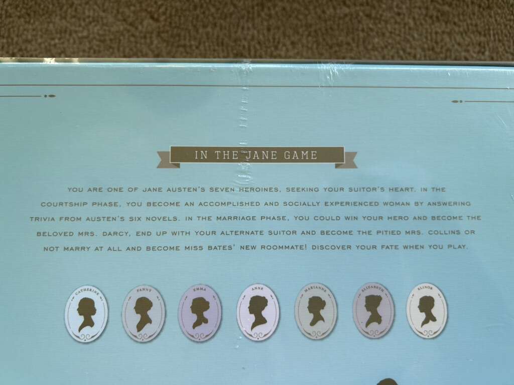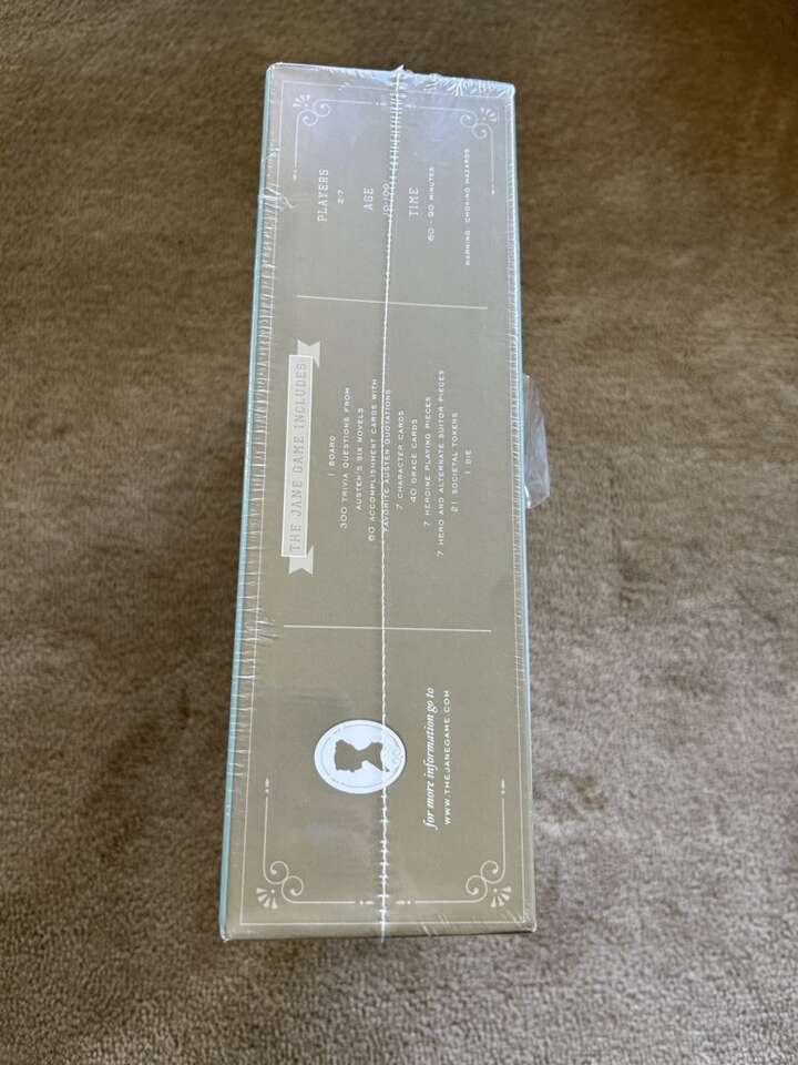 NEW (sealed in plastic) The Jane Game: A Jane Austen Trivia Game devoted to her six novels. 2-7 players, ages 10+. By Laconia, Elizabeth Bankhead, Gloria Pak, and Leslie Freitas. A Kickstarter product, 2013. No longer in production. New, unopened condition. Plastic slightly torn on bottom. Text only. Cash or Venmo.