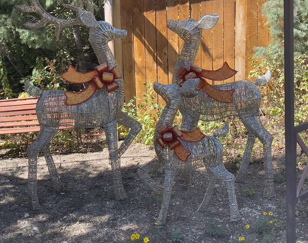 This delightful decorative set includes 3 deer, a family of deer. Complete with a buck, a doe and a fawn, the deer are covered in a glittering mesh fabric and each piece is lit up by warm white LED bulbs. Each deer is wearing a red bow and bell around its neck. The buck, 52 high, 27 long and 11 wide; the doe, 42 high, 28 long and 12 wide; the fawn, 28 high, 18 long and 9 wide. Champagne wire, 72 long leads, 210 count total warm white LED lights. Plug-in adapter powered, safe low voltage, 30 volts, 8.12 watts.
