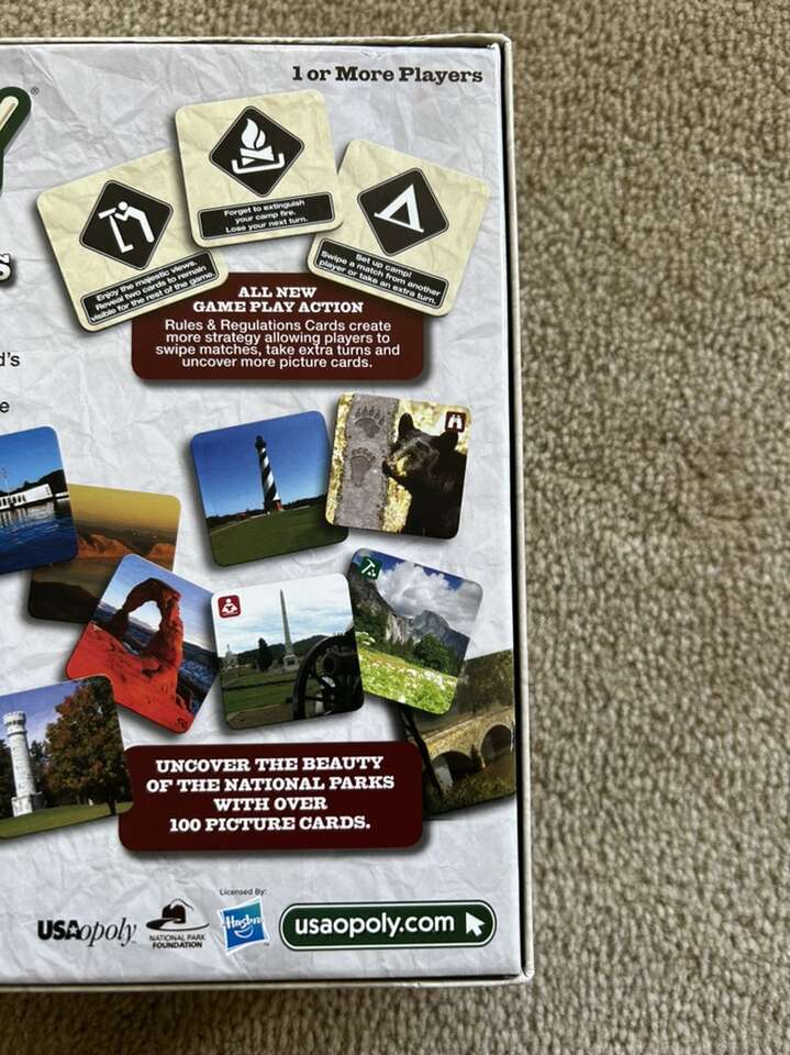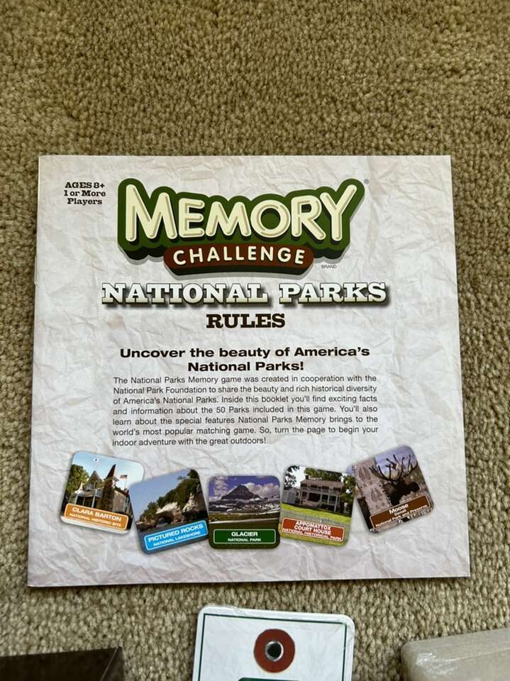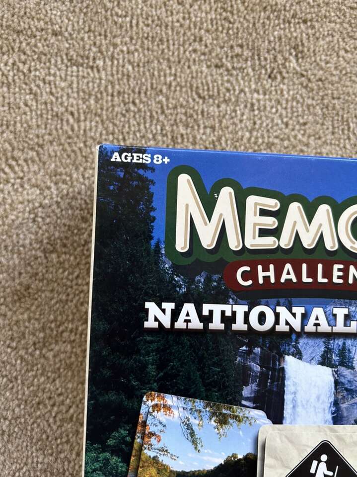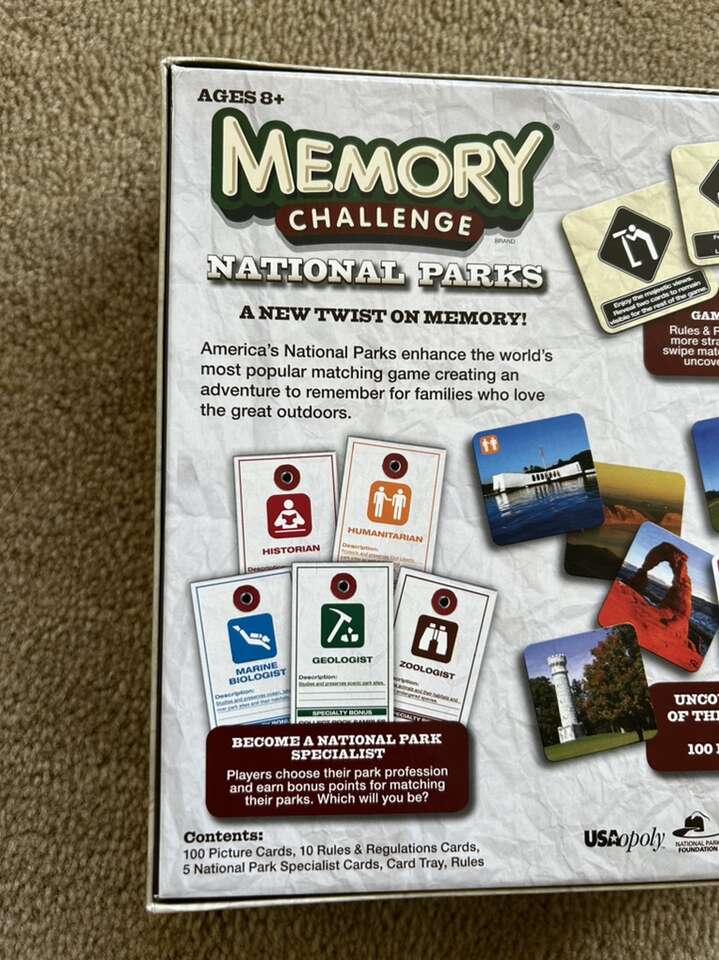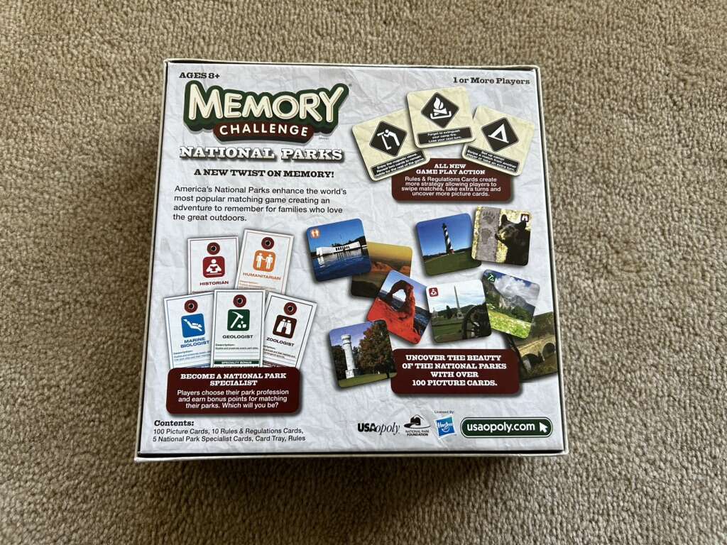NEW (open box, sealed components) Memory Challenge Game: National Parks edition of the classic game. New strategy and more fun! Ages 8+, 1 or more players. By USAopoly, Hasbro, 2011. New, unplayed condition (one box corner slightly worn). Text only. Cash or Venmo.