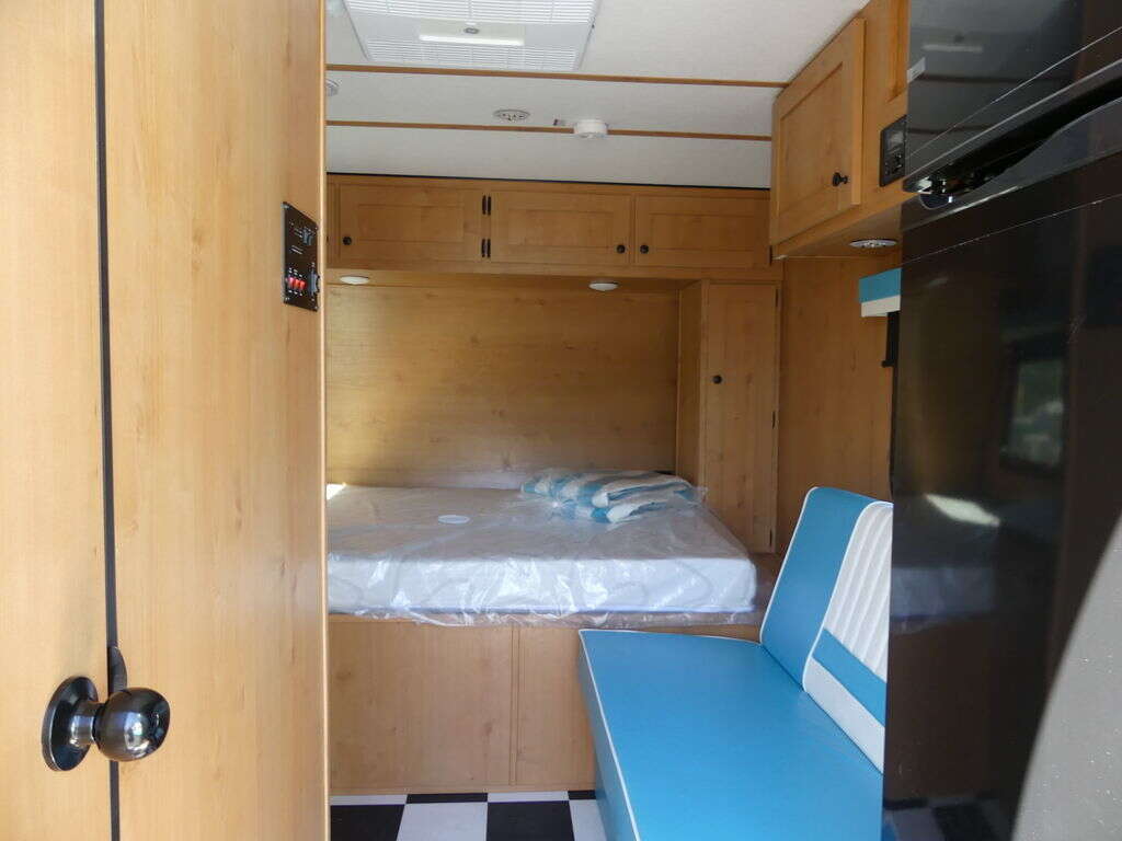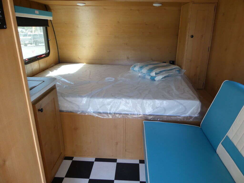 STEP INSIDE & BACK IN TIMEThe interior of the Retro stays true to the name with the classic, black and white checkerboard flooring reminiscent of the 1950’s diner style. Dinette cushions pop in aqua, red, or seafoam green, but are also available in grey for a more neutral look. Bright birch wood covers the interior walls and cabinetry, securing the vintage style.