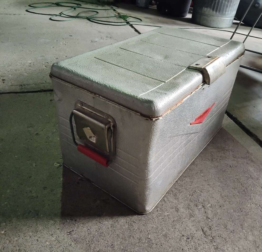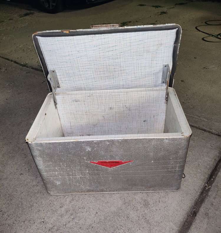 Antique 1950s thermaster cooler. Missing bottom latch. Yard decor or collectors item
