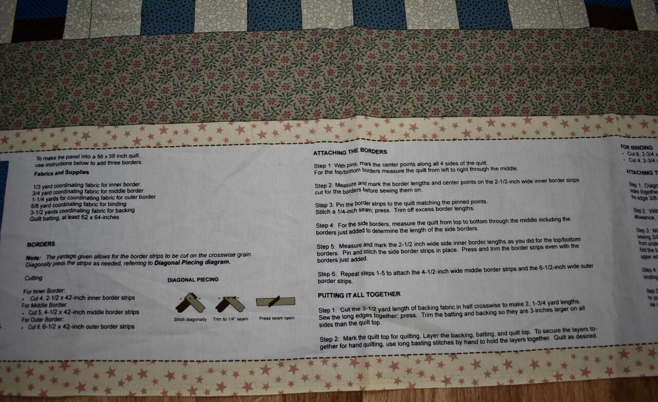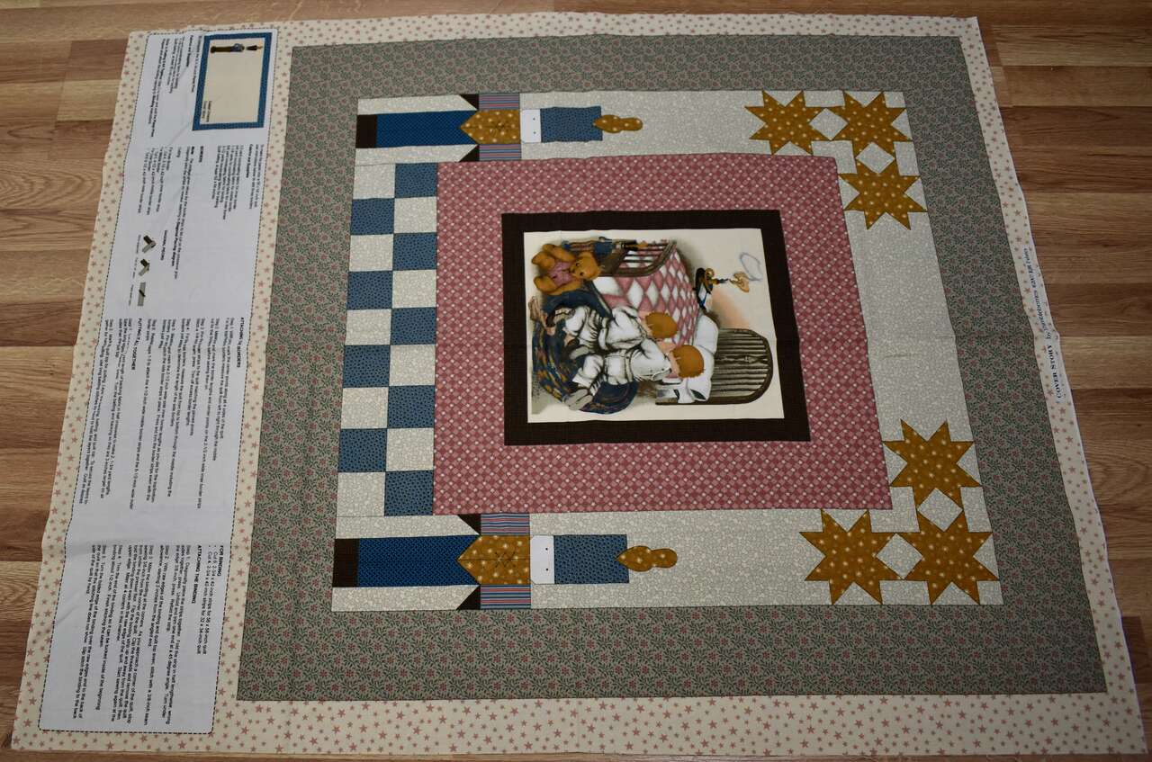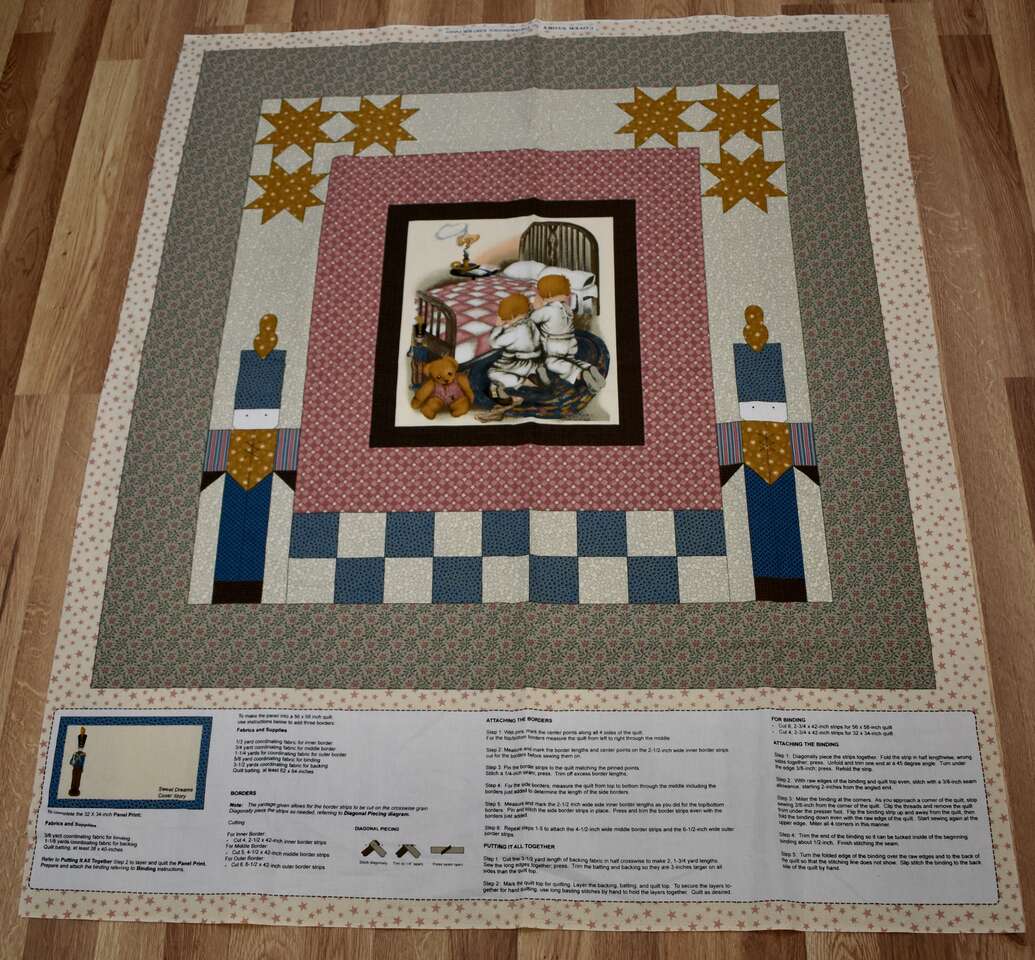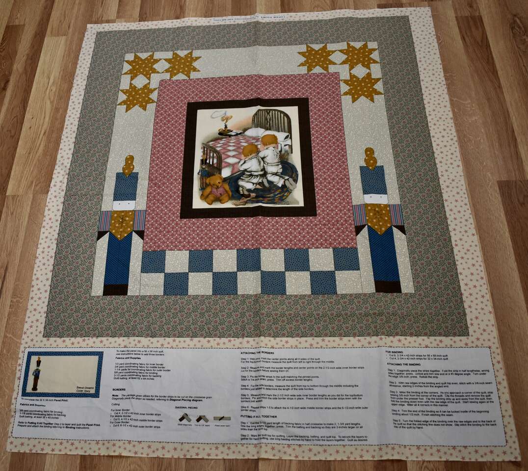IT MEASURES… The Whole fabric Piece measures…36 Wide X 44 Long — The Useable Fabric Panel area measures approx. 36 X 36. You could add more Fabric to this Panel to make it into a bigger quilt if you wanted to do that, also.
