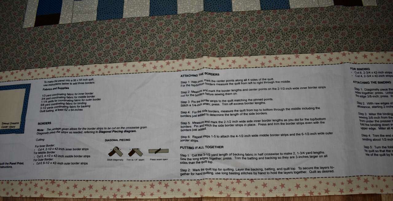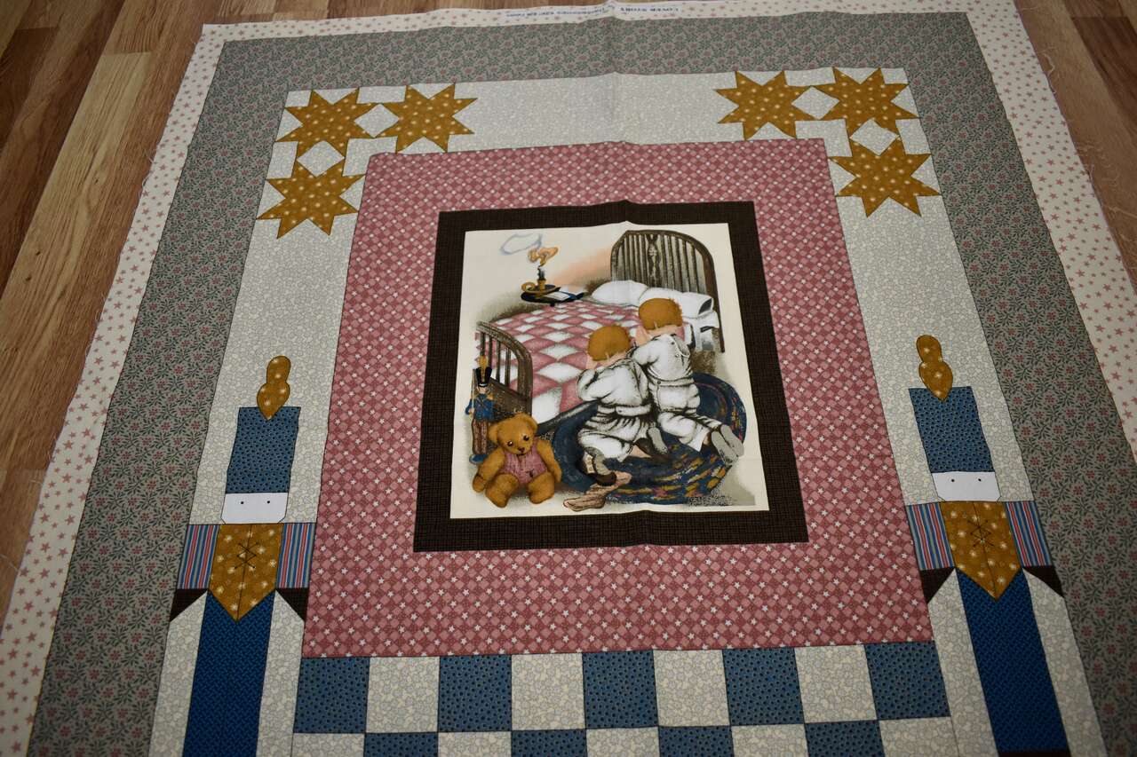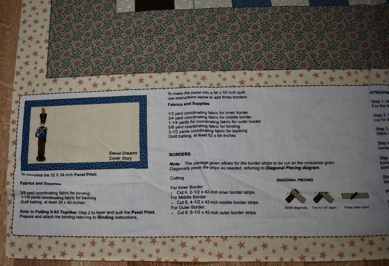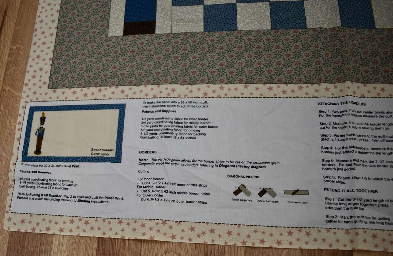 IT MEASURES… The Whole fabric Piece measures…36 Wide X 44 Long — The Useable Fabric Panel area measures approx. 36 X 36. You could add more Fabric to this Panel to make it into a bigger quilt if you wanted to do that, also.