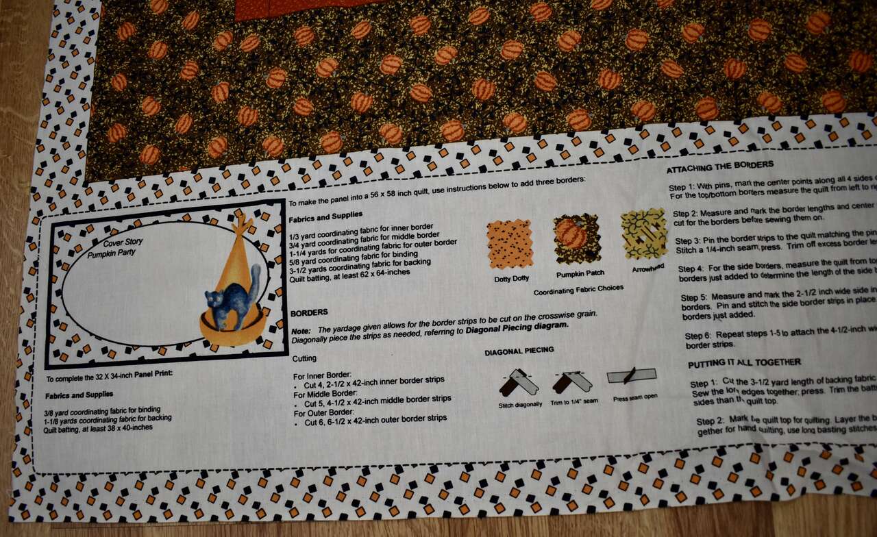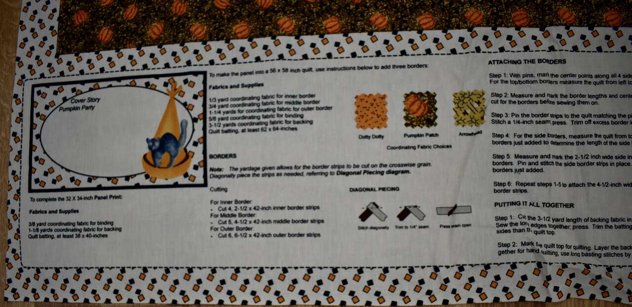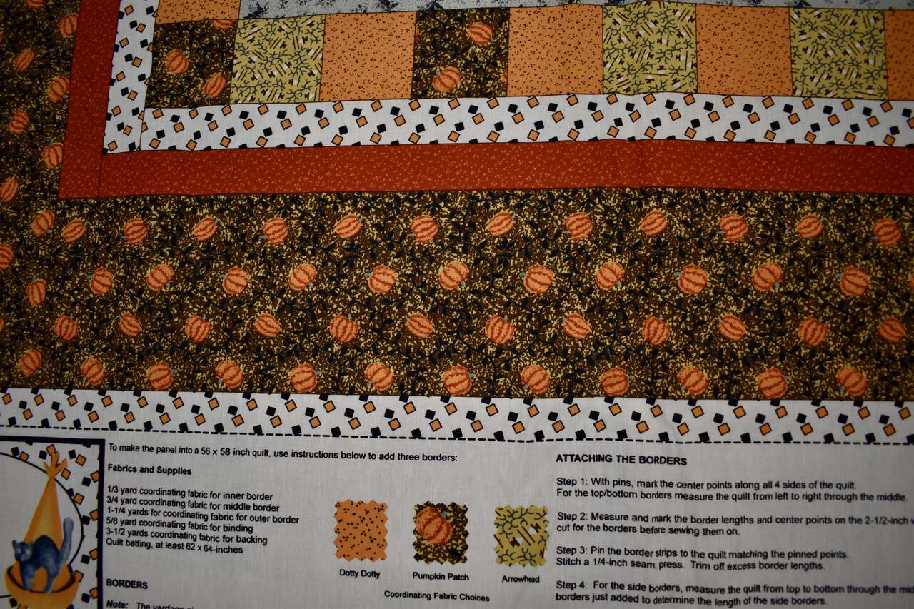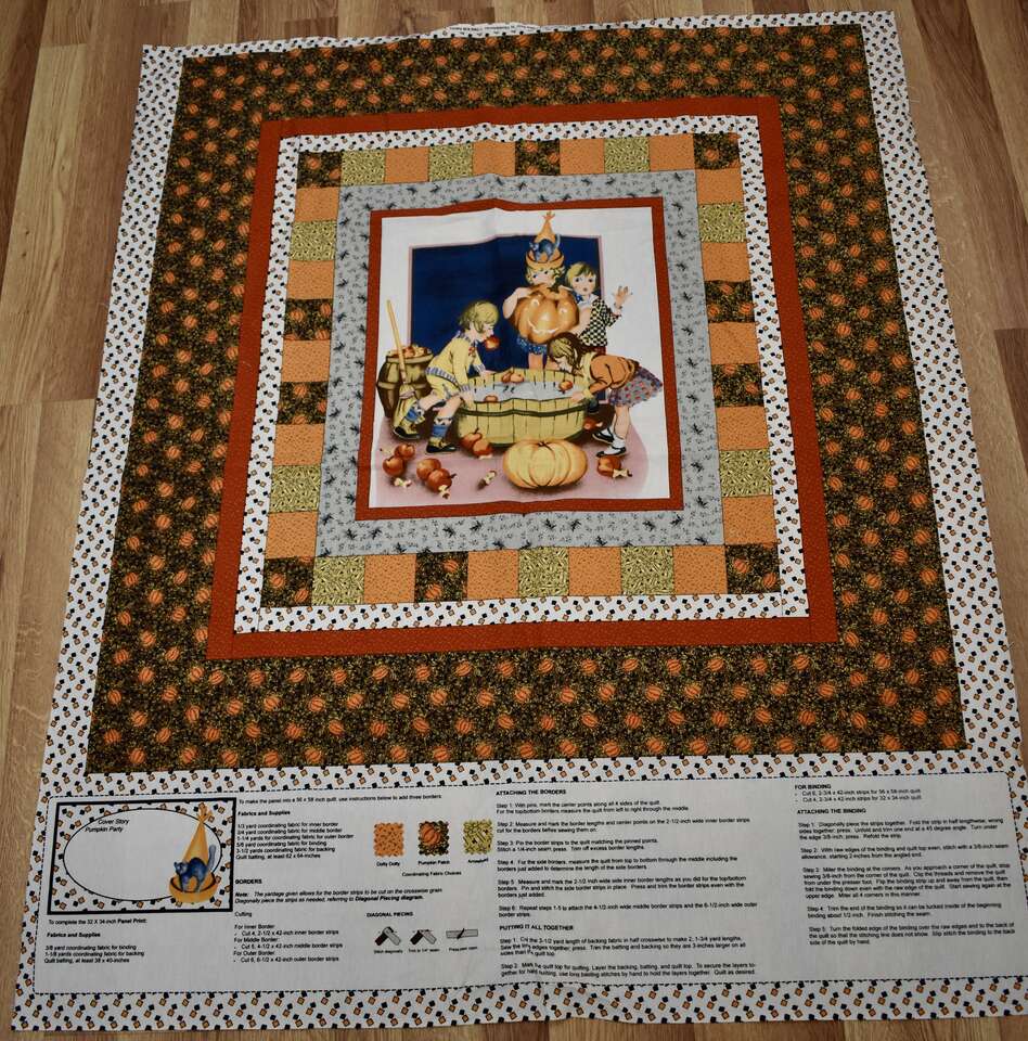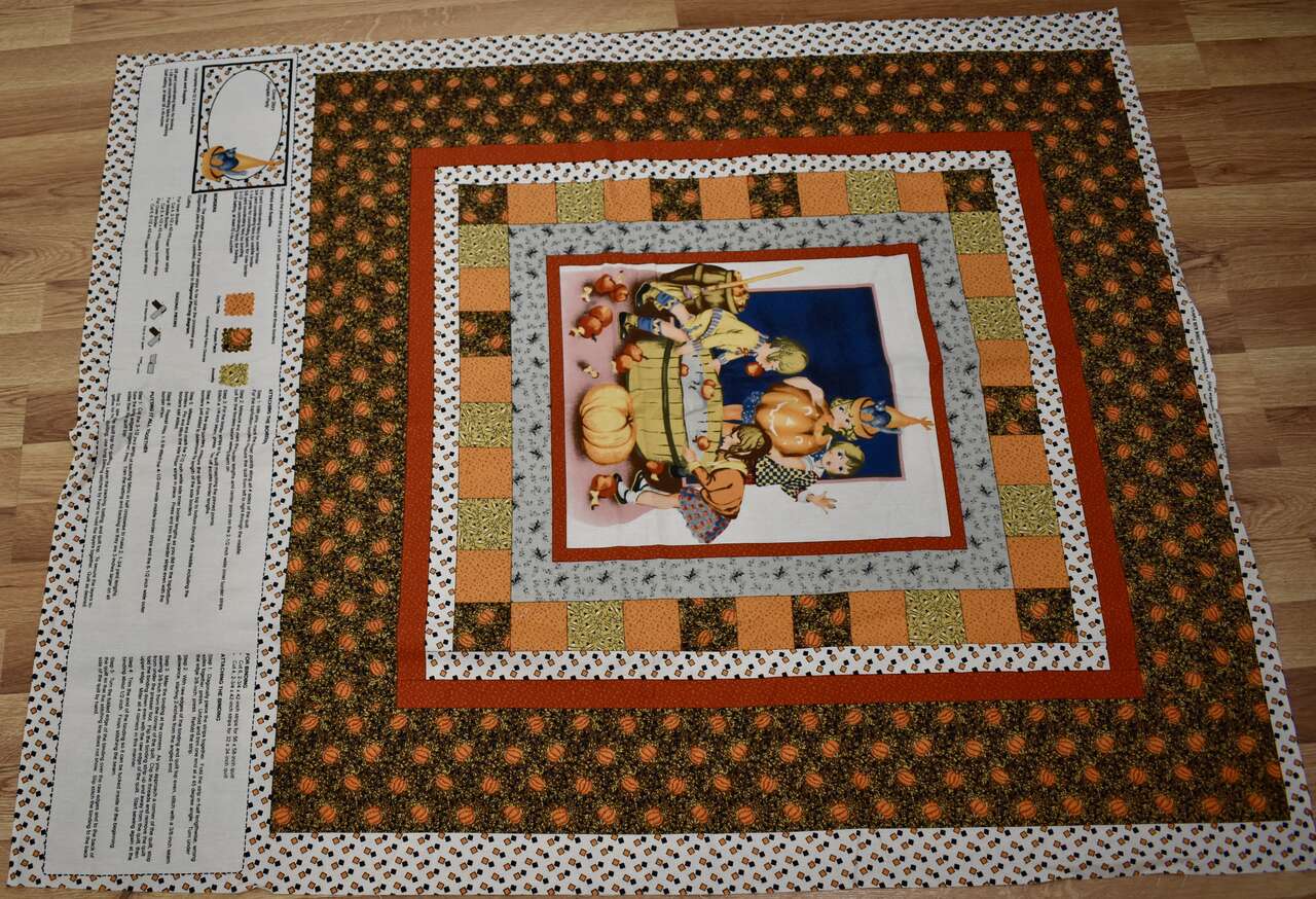 IT MEASURES… The Cotton Fabric Panel Measures… 36 inches wide X 44 Inches long and the useable area of the Panel Measures approx. 36 X 36 without the instructions area.