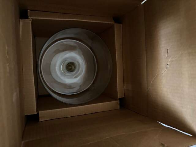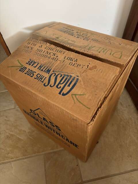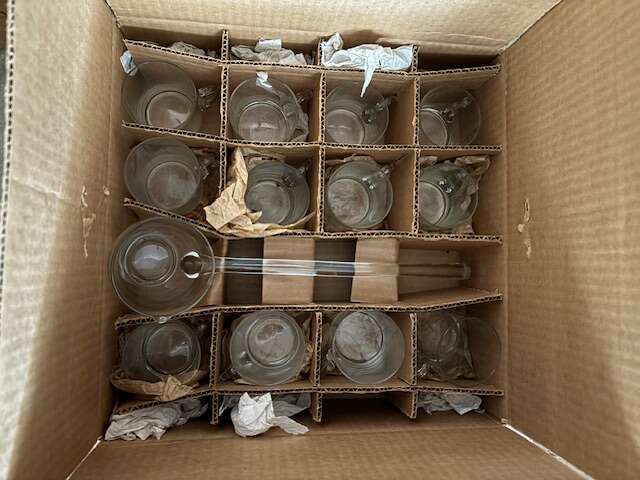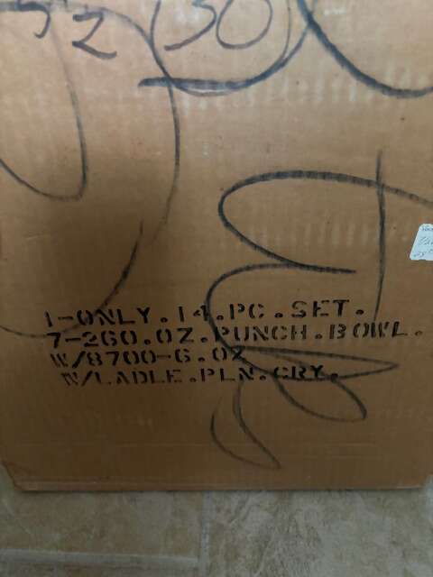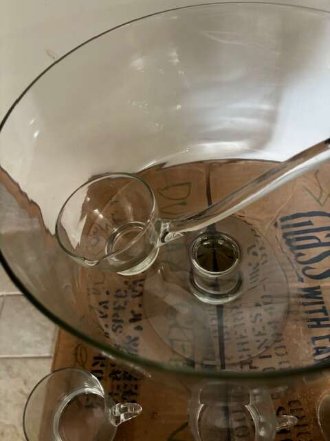 High footed punch bowl with ladle and 12 hand blown glasses. In original boxes $100