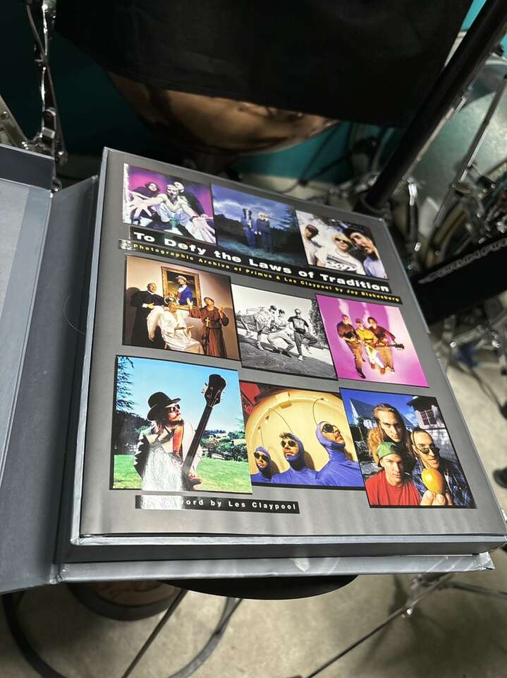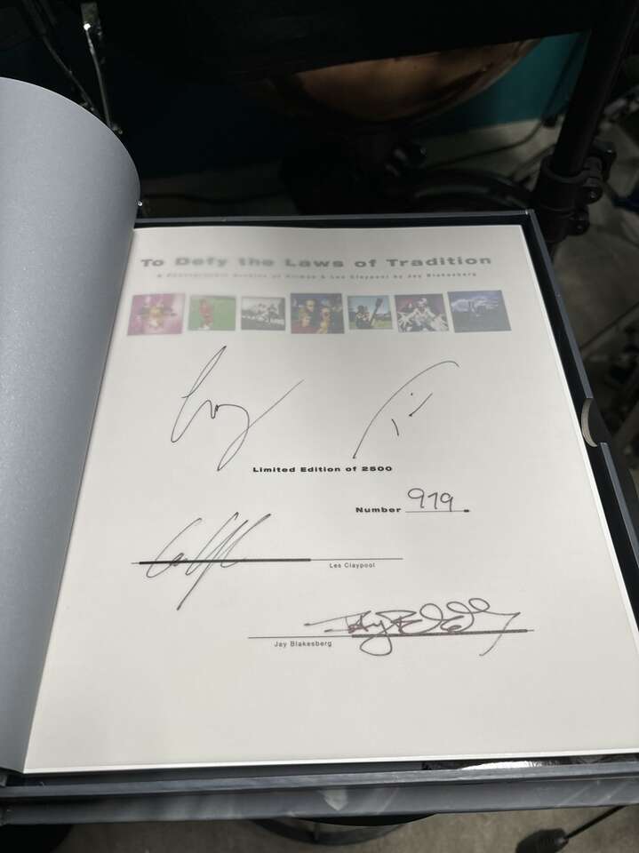 Unique book because it is signed by all three members of Primus Larry Ler Lalonde, Tim Herb Alexander, and Les Claypool. Most of the books were only signed by Les himself.