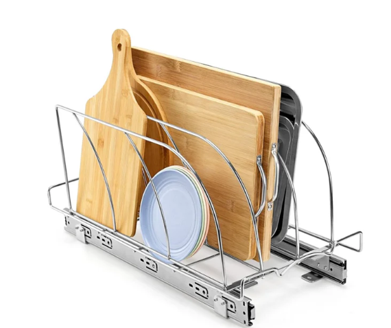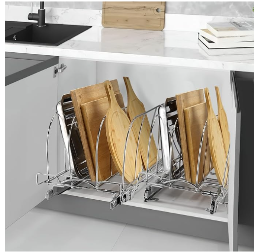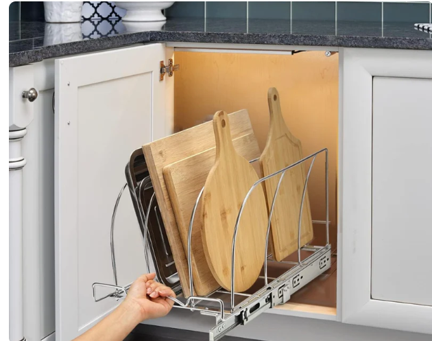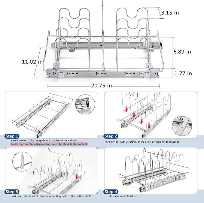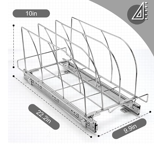 Under Cabinet Pull Out Organizer: Includes 3 large dividers for organizing your bakeware, cutting boards in lower cabinets or storage. Dividers keep the bakeware upright and separated so you can quickly see and access what you need. Keep the kitchen organized: Avoid Stacking! The coated steel dividers will never pop or scratch, so the bakeware is always protected. The sturdy base is stable enough to keep even baking sheet and cake trays neatly placed and ready to use. Storage Rack Bearing: The storage rack under the cabinet can bear all cutting boards and baking trays, and can bear a weight of 35 pounds. Installation Method: portable installation, only need an electric screwdriver to use our screws to fix it on the countertop or under the cabinet, so that our sliding cutting board storage rack can be easily used, bringing clean and tidy to your kitchen and removing clutter and odor. Minimum Cabinet Opening Dimension: 22'' D X 10''W X 18''H.Recommended to measure your cabinet opening before purchasing.