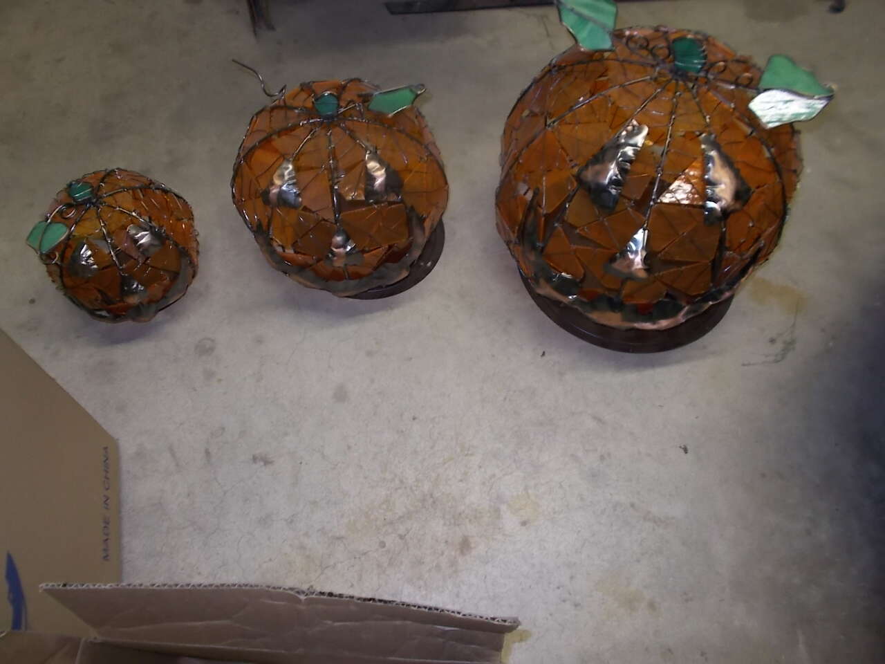This is a set of 3 Handcrafted Stained Glass Pumkin Candle or Tea Light holders. Each Pumpkin has it's own tray holder with places to put the candles on it. They are just so cute and very well made. They have never been used. If interested please phone 801-823-7198 and ask for Laura. Thanks