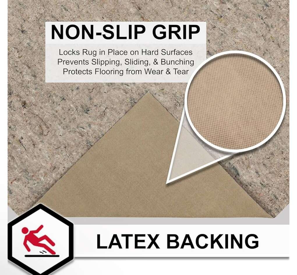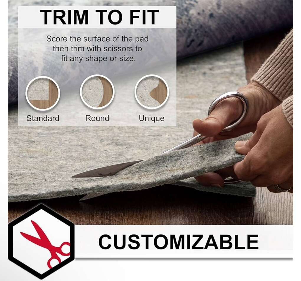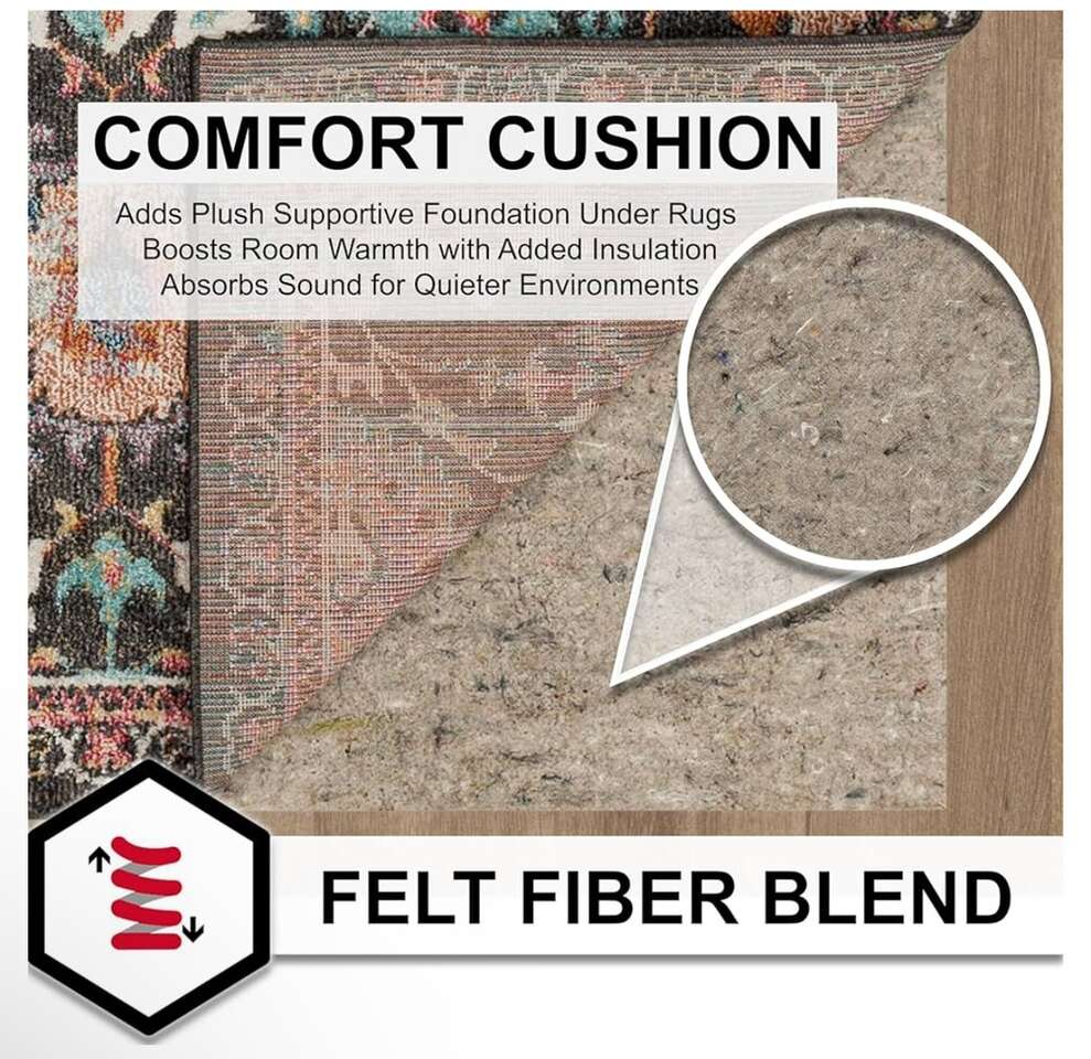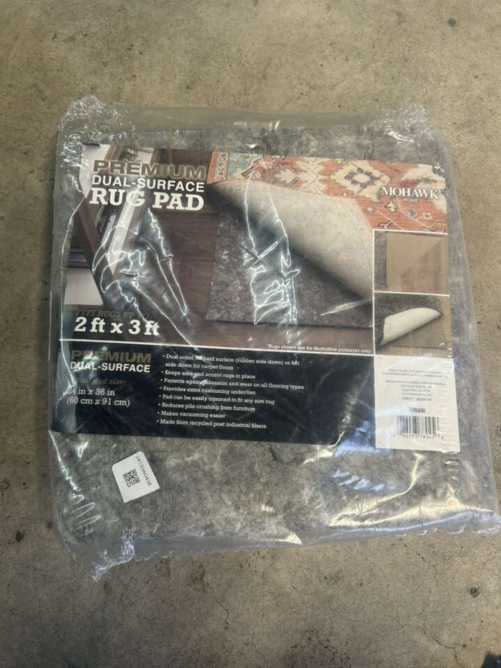 Top highlights Product Dimensions 36L x 24W Brand Mohawk Home Material Polyester, Recycled Materials, Felt, 95% Polyester/ 5% Other Fibers Size 2' x 3' Color Grey Item Weight 1.4 Pounds DURABLE COMFORT CUSHION: Choose from three felt thickness options - 1/4, 3/8”, and 1/2 - offering various levels of soft feel underfoot, flooring protection, sound absorption, insulation, and all-around extra comfort for your area rugs in any room around your home. EXTRA GRIP: The latex rubber backing provides additional grip under your area rugs to help prevent slipping, sliding, bunching, and wrinkles during everyday use. (area rug not included) RECOMMENDED USE: Larger area rugs, over 5x8, with latex backing provide the best non-slip functionality. For added non-slip grip to scatters, runners, and other smaller area rug sizes under 5x8, it is recommended to use rug tape or non-slip corner tabs to help prevent slipping and sliding in high traffic spaces. CUSTOMIZABLE SIZING: Simply score the surface and trim your rug pad with scissors to fit any area rug size or shape. For the 3/8” and 1/2 thick rug pad options, it is recommended to trim the pad 2” short of your area rugs perimeter. For the 1/4 thick rug pad option, it is recommended to trim the pad 1” to 2” short of your area rugs perimeter. FLOORING TYPES: For carpet, simply place the rug pad under your rug with the felt side down. For hard surface flooring, place the rug pad under your rug with the non-slip latex rubber side facing down.
