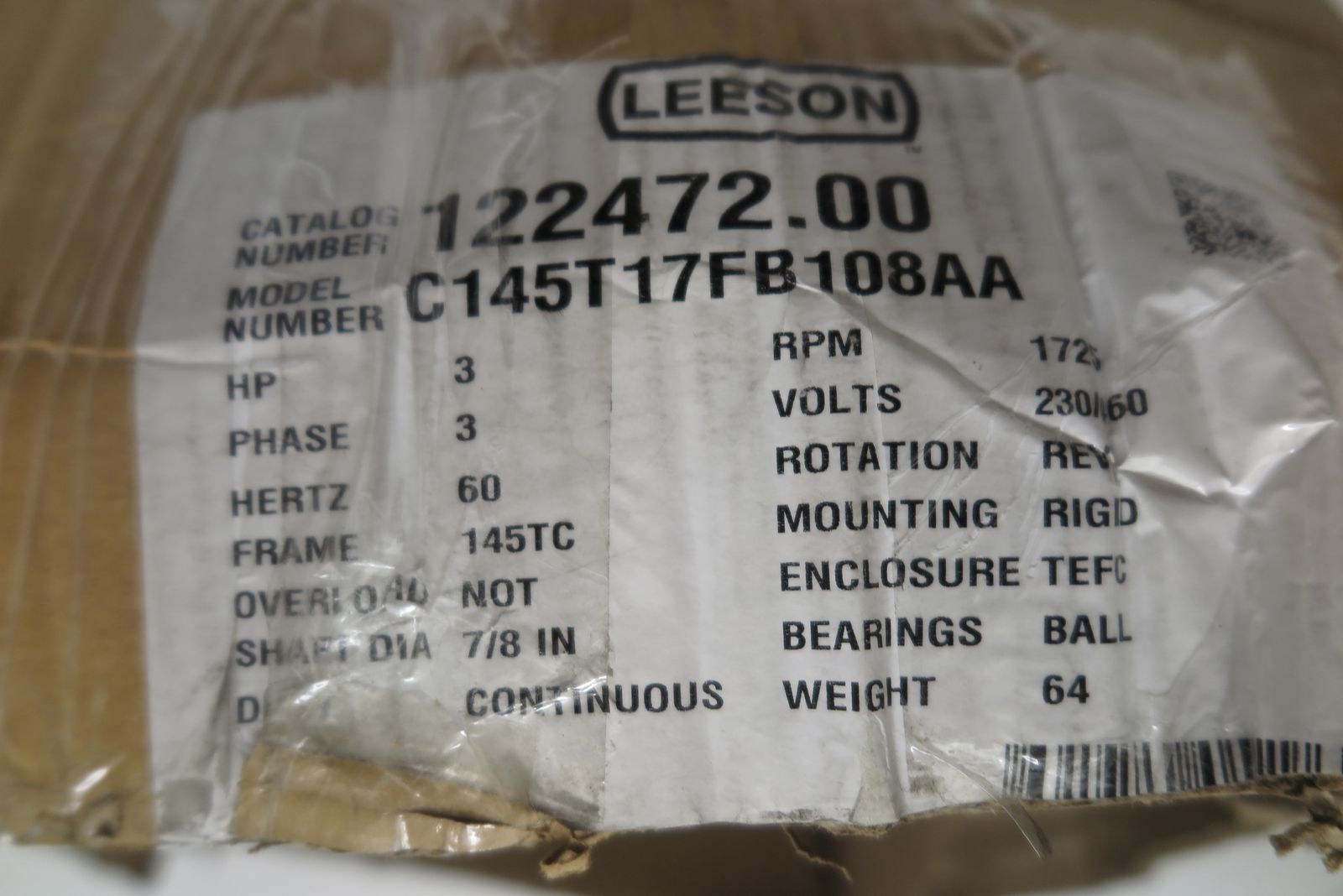 Leeson 122472.00 3HP 1725RPM 145TC TEFC 230/460V 3PH 60HZ CONT 40C 1 0SF RIGID