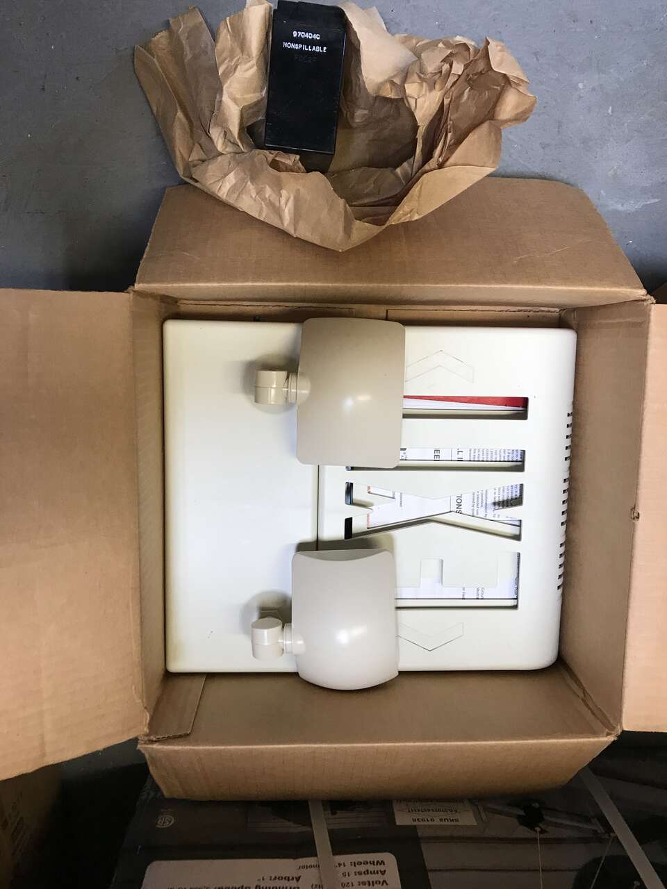 Emergency exit sign with floodlights hardwire or plug-in this is an industrial grade exit sign that lights up with floodlights when the power goes out to a safe evacuation and a power outage. Comes with a 6 V battery that will act as a battery back up in a power outage.