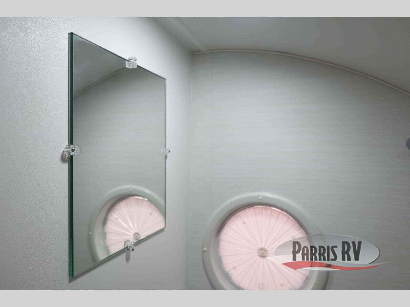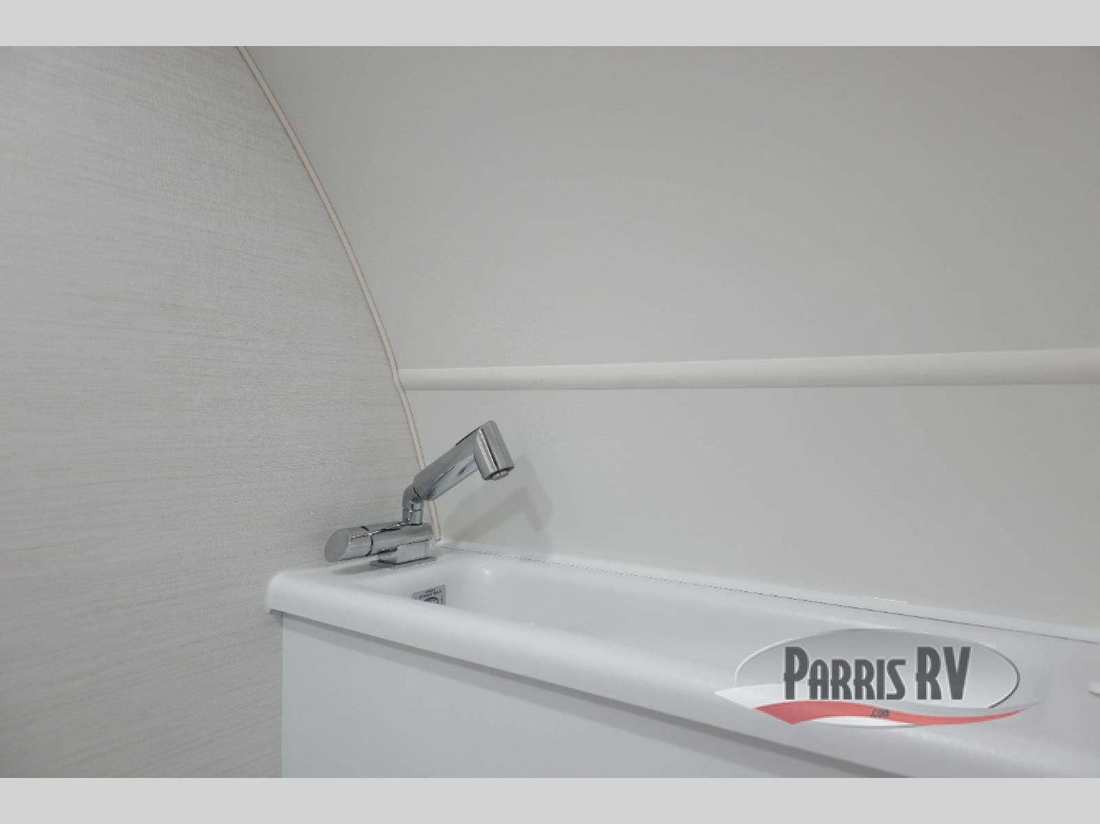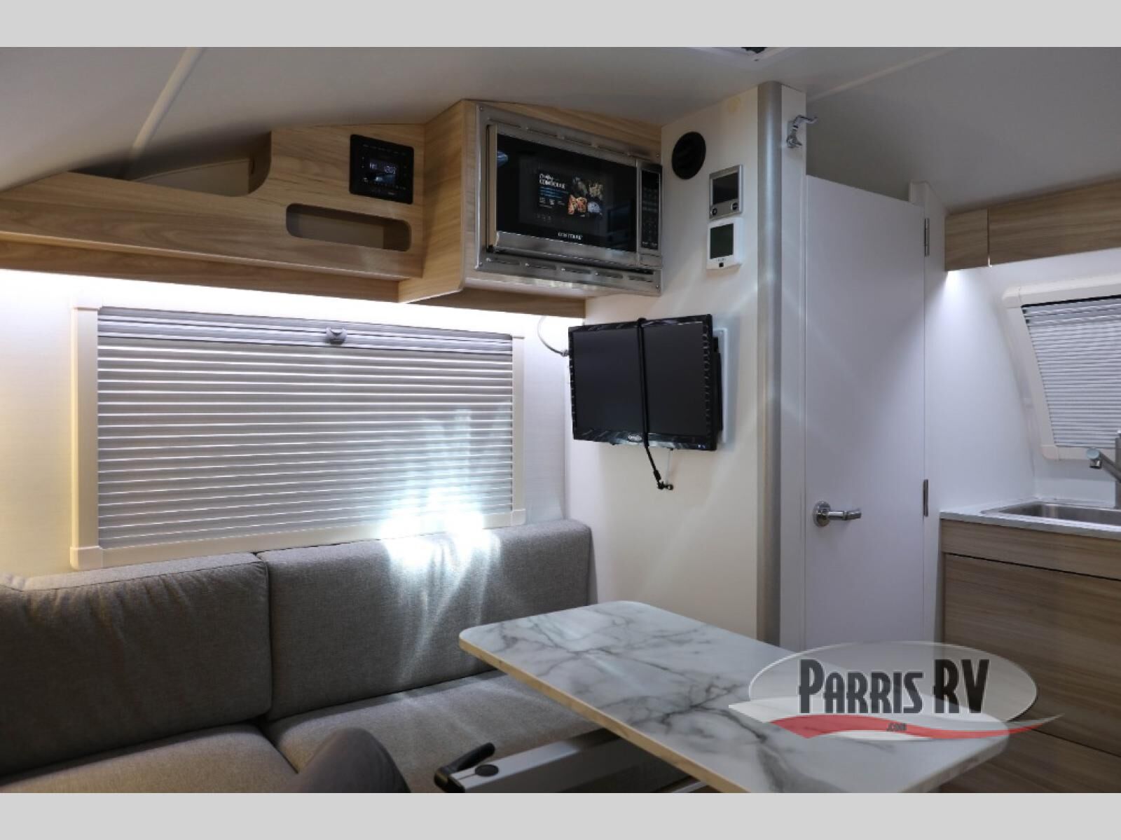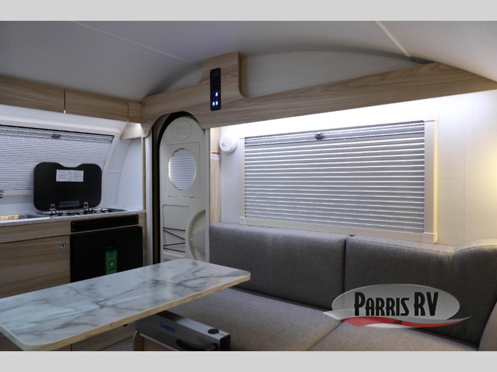 With any TAB 320 teardrop trailer by nüCamp RV, the interior offers premium soft-close cabinetry, a front window, plus a wet bath with a cassette toilet and a molded sink. The iconic teardrop design offers an easy-to-tow unit with amenities found in much bigger trailers. Some other highlights include the Alde heating/hot water system, the central air conditioner, 180 watt solar panel, and the Nautilus water system with an external shower. The optional Boondock and Black Canyon packages include an additional 310 watt solar panel, holding tank heaters, and under-glow lights. With these upgrades your tow length increases by 3" and hitch and gross weight will be higher as well!