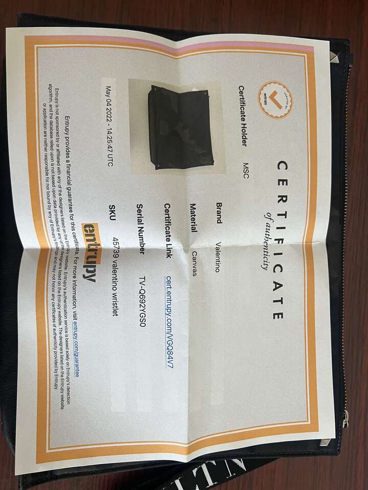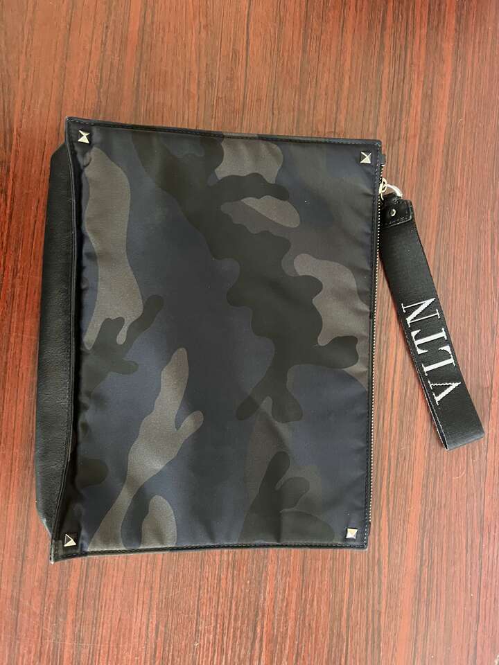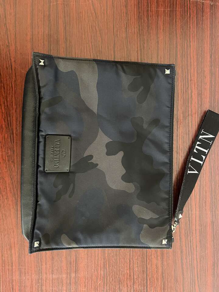 Add a touch of luxury to your outfit with this stunning Valentino Rockstud wristlet. The unique camouflage pattern and multicolor canvas exterior make this clutch a one-of-a-kind statement piece. The leather h strap adds a touch of sophistication to the design. This small clutch is perfect for carrying your essentials and adds a touch of elegance to any outfit. The COA ensures the authenticity of the product.