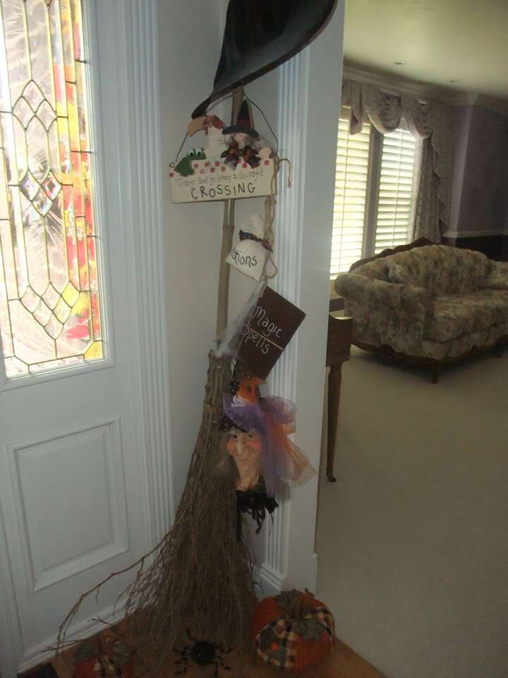 VenmoSee second photo for full view. Halloween Witches Broom Decoration with lots of fun things hanging on it - about 7' tall with a black hat on top, potions book, witches head, spiders, etc. Fairly new - paid twice this but downsizing.