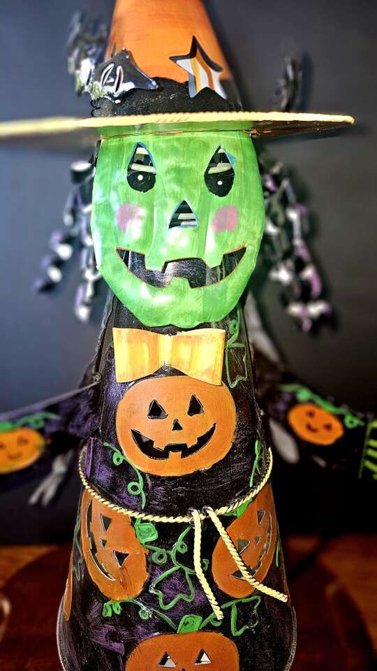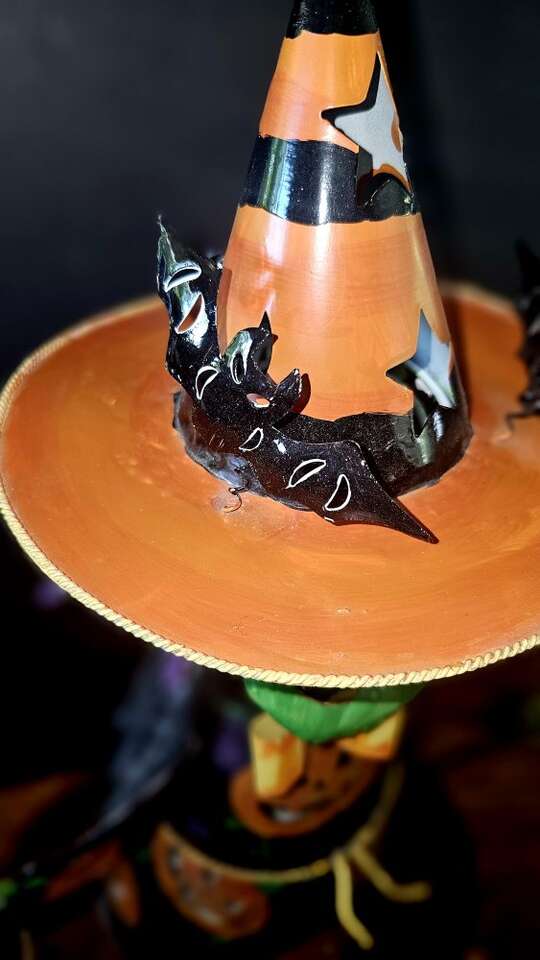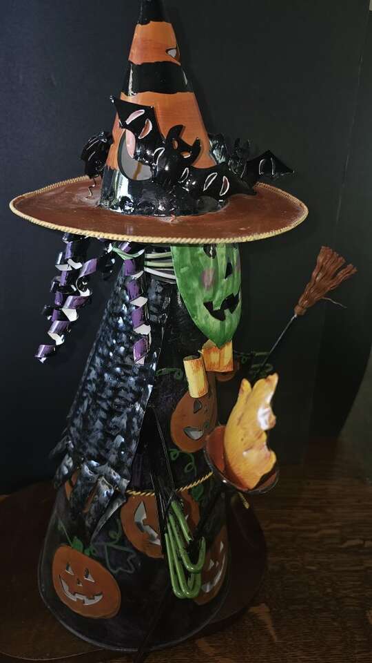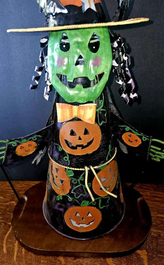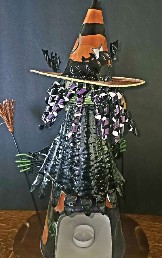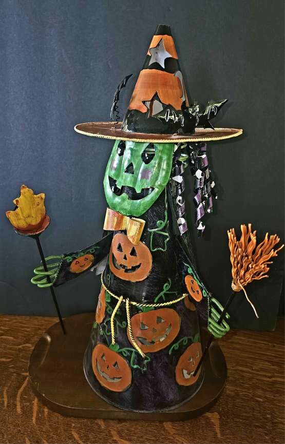 Green faced, fashionable, all metal, Halloween witch at work ! She has a bobblehead, movable arms, and holds a candle or a plug-in electric light. This is a vintage tabletop witch and is shiny and looks new. $44.00 - OBO