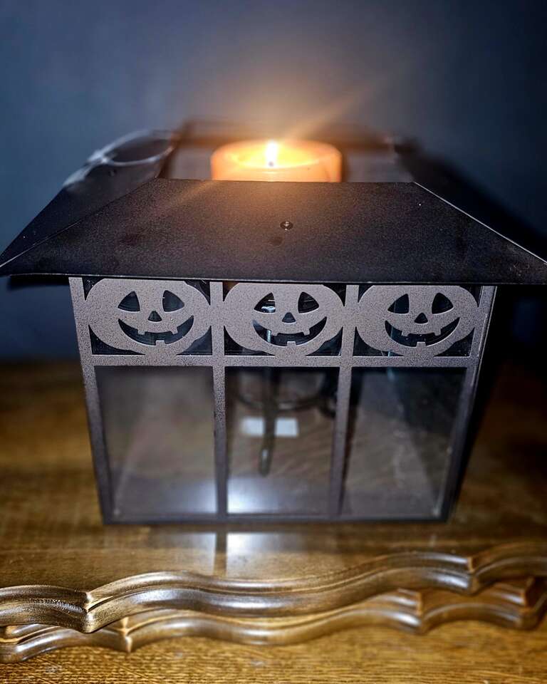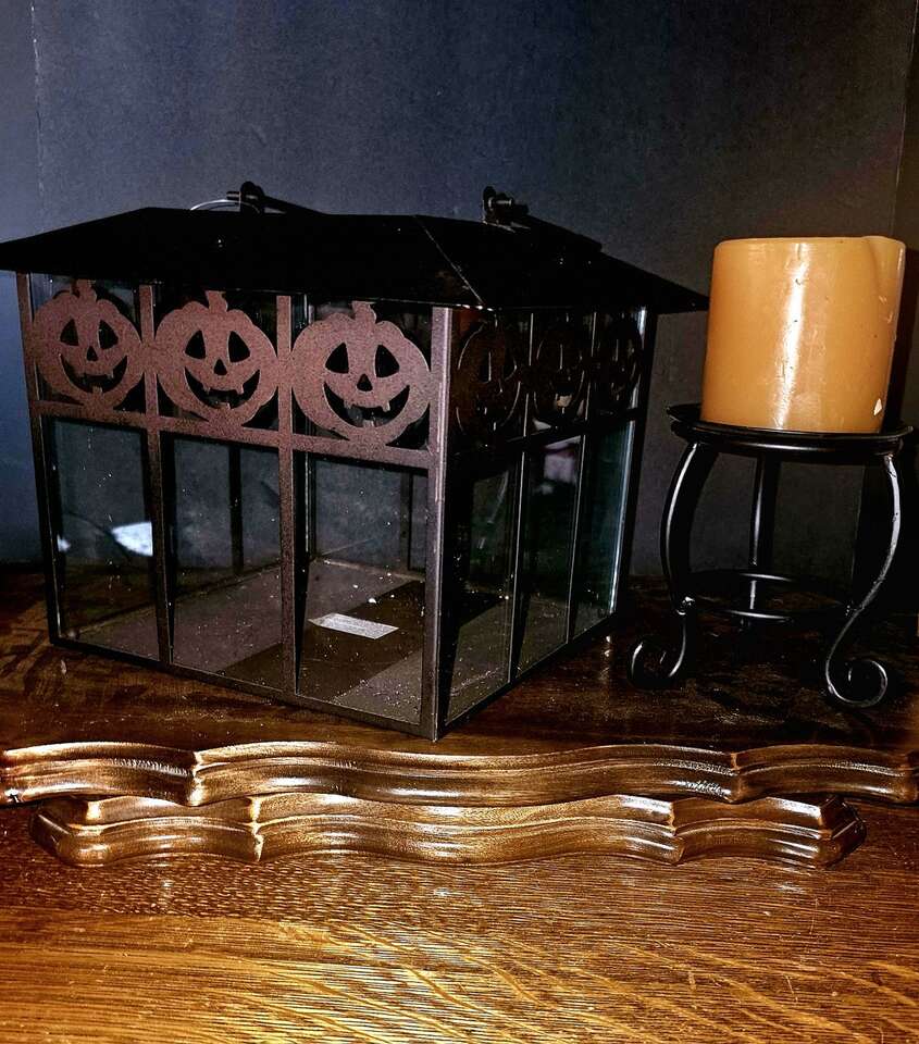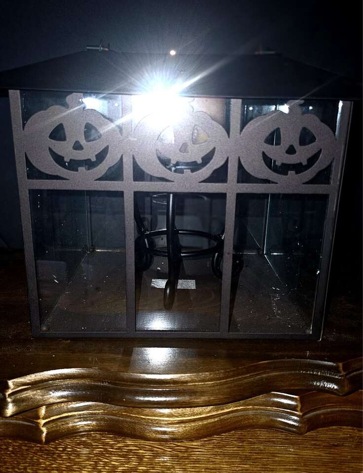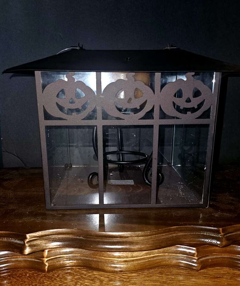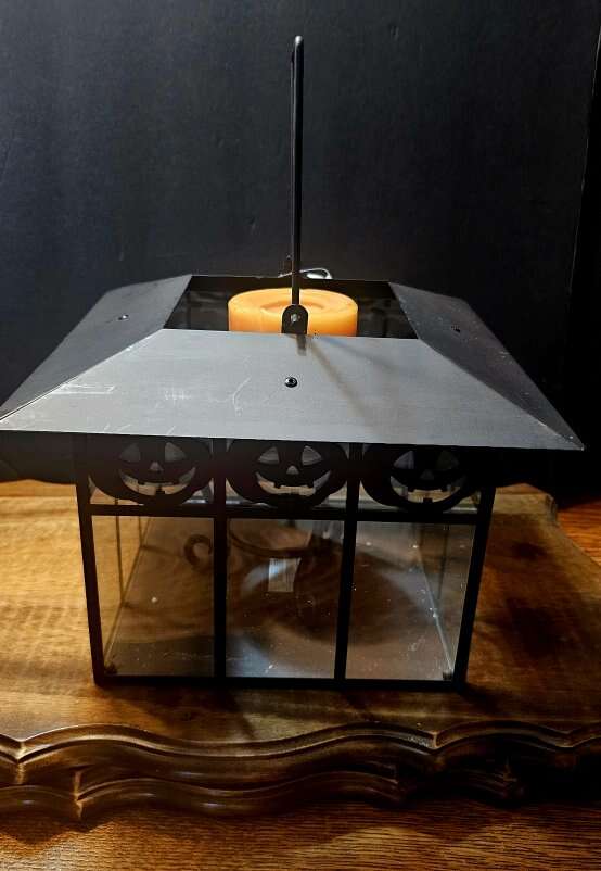 This is new, but vintage, with the original Mervyn's tag. It's a larger, all black metal and glass lantern with 12 cute whimsical cut-out Jack O Lanterns