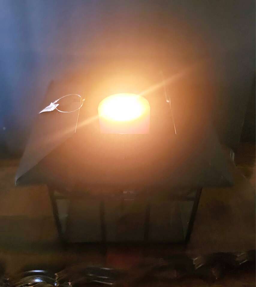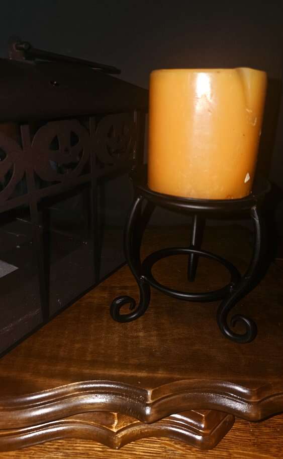 Separate removable black metal pedestal candle holder inside and metal hanger on top for hanging.