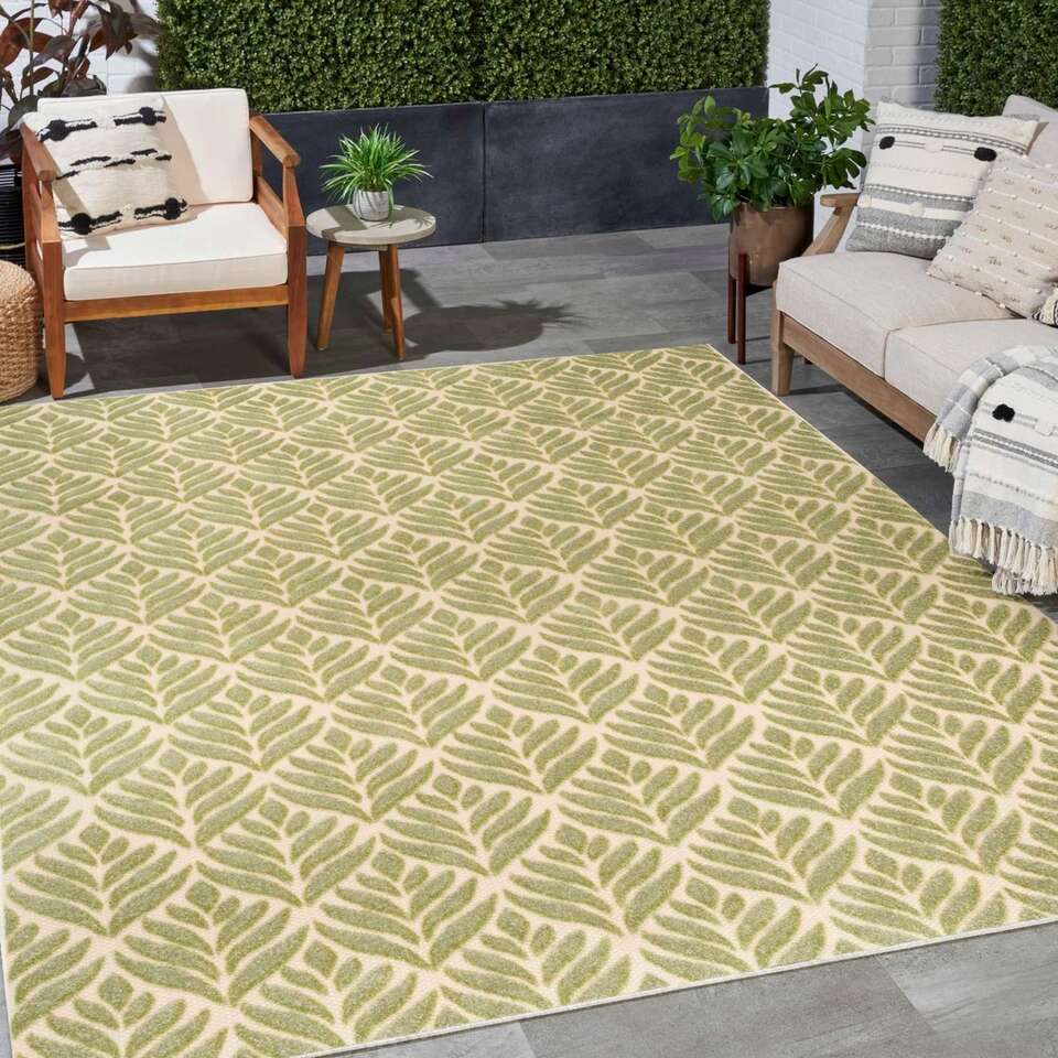 Transform your patio, porch, or deck into a tropical oasis with this Veranda indoor/outdoor rug. Its flatwoven surface is adorned with an eye-catching raised leaf pattern that adds delightful texture to your floors. Choose from colorful or neutral colorways to suit your design needs. Stain-resistant polypropylene fibers are easy to clean: simply sweep away debris, hose rinse, and air dry.