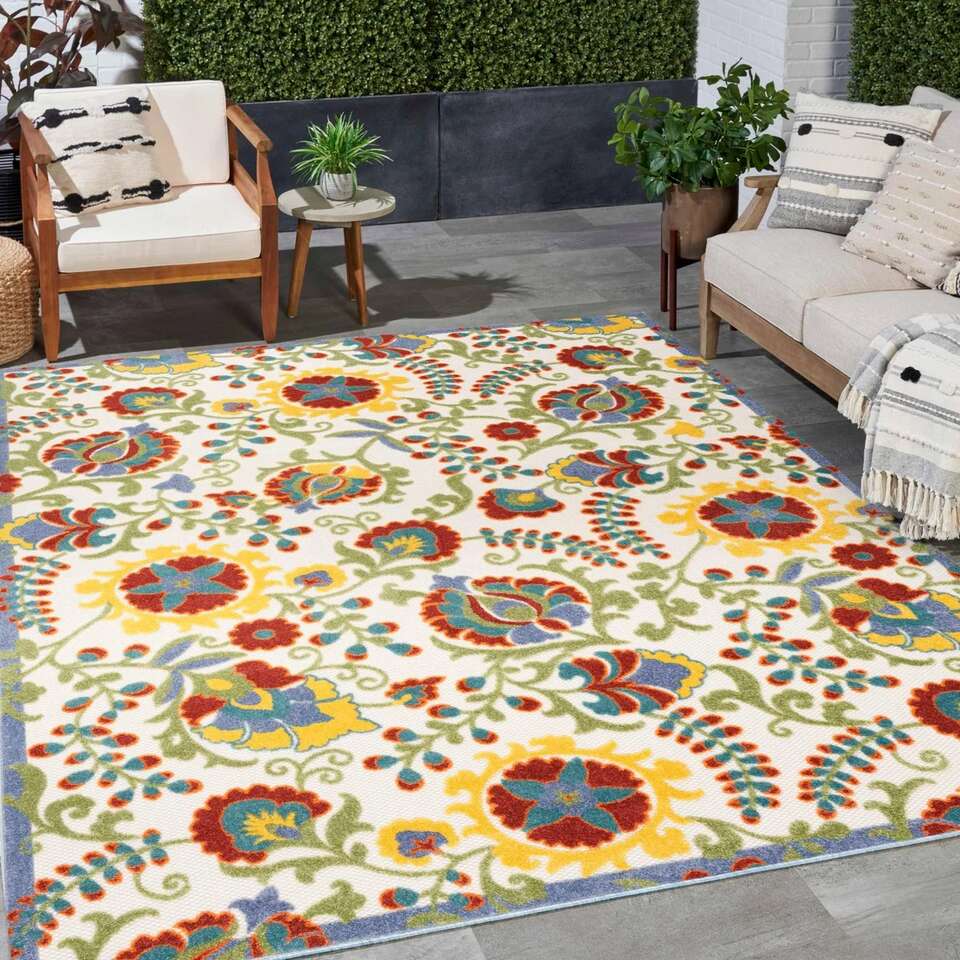 The Veranda Indoor-Outdoor Area Rug or Runner brings fresh appeal to your patio, porch, or deck. Tropical-inspired florals and chic geometric patterns, woven in high-low style, offer a pleasantly soft texture that is just as lovely to look at. Stain-resistant polypropylene fibers are easy to clean: simply sweep away debris, hose rinse, and air dry!