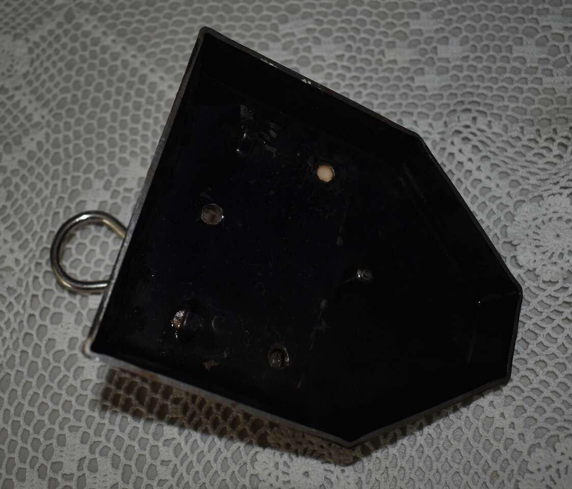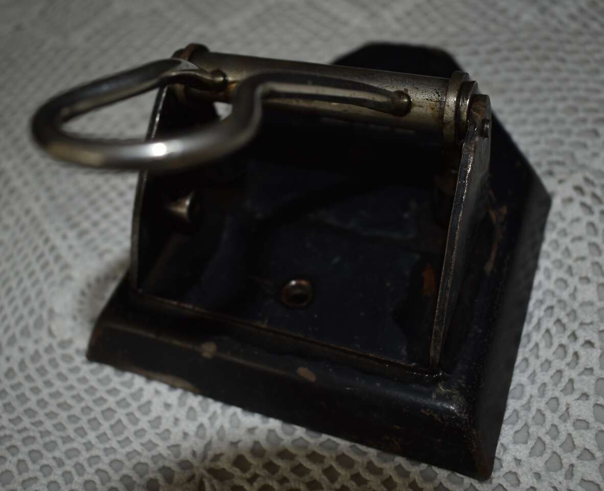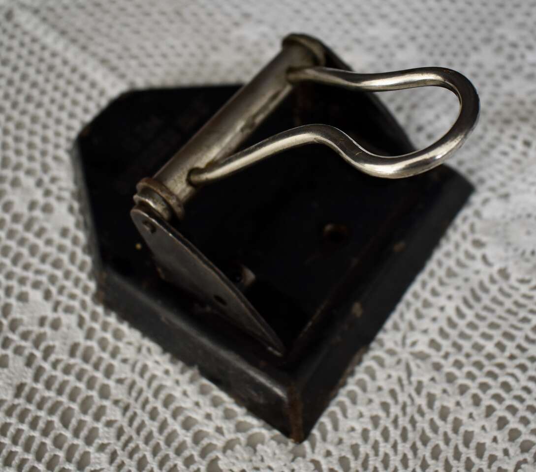 IT MEASURES… APPROX. 5 1/2 INCHES LONG X 4 1/2 INCHES WIDE. IT STANDS APPROX 5 1/8 INCHES TALL WHEN THE LEVER IS PULLED TO THE TOP POSITION.