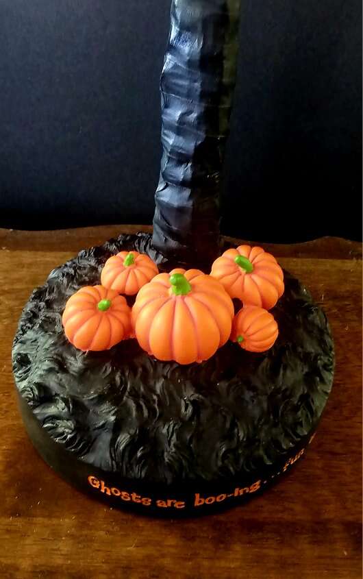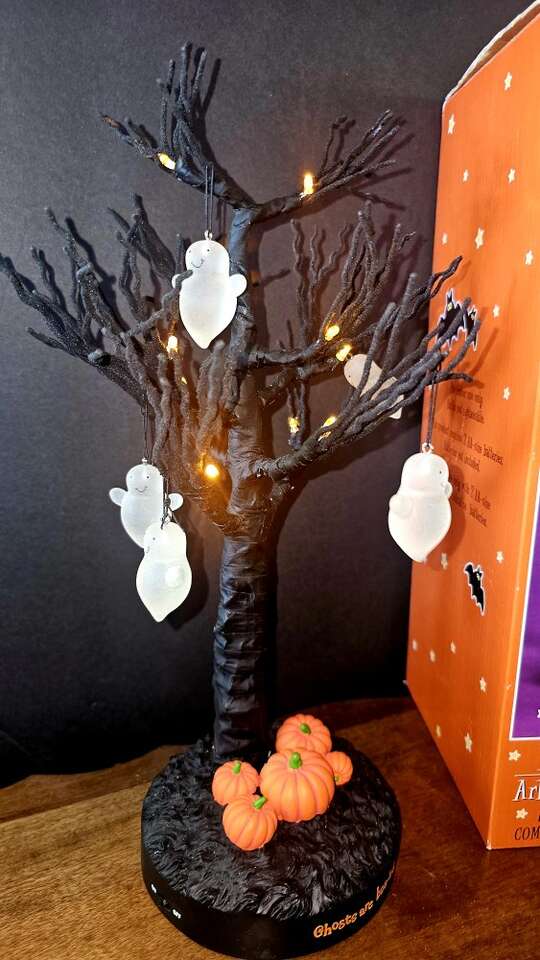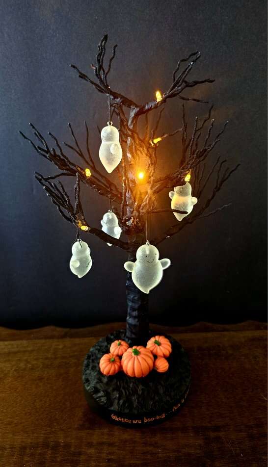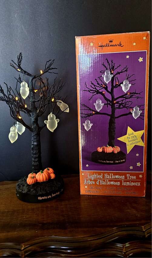 Like new, vintage Halloween Hallmark Spooky black-wrapped tree with 5 darling, chubby clear, free-hanging Ghosts. Bottom black Base says: 'Ghosts are Booing... Fun is Brewing' Convenient On/Off switch. This is NOS very vintage but like new. In the original box and lights up