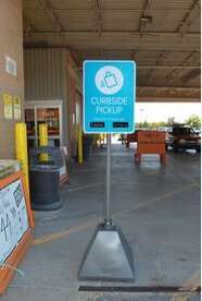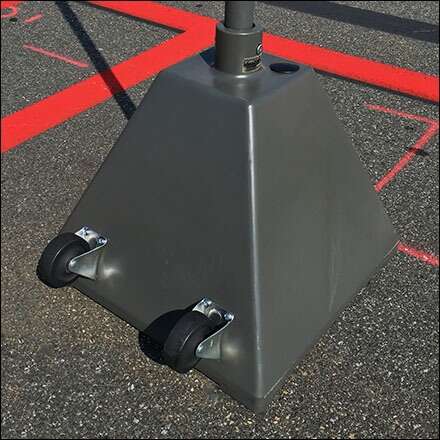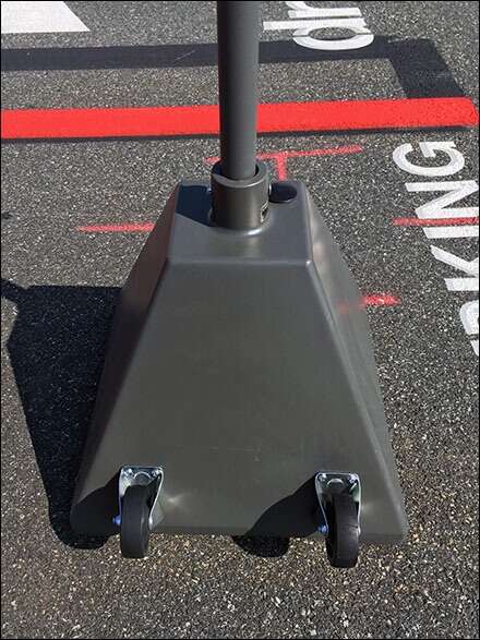 Heavy truncated pyramid bases. Use the Sign Standard itself as both lever and handle, tilt the affair onto the Dolly Wheels, and off you go. Why make the Sign Standard mobile when the pavement is permanently marked for Drive-Up Order Pickup use? Moving the standards is advantageous for snow plowing, pavement patching, and cleaning.