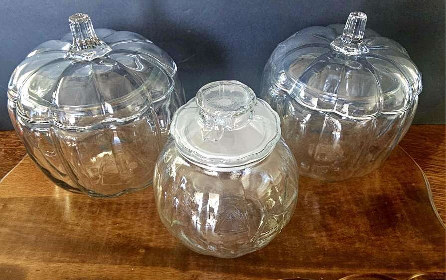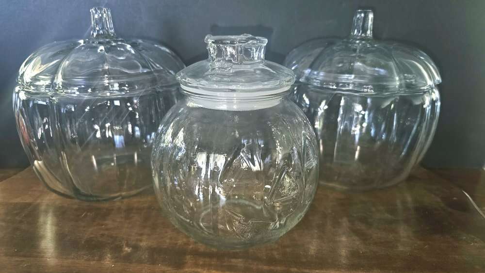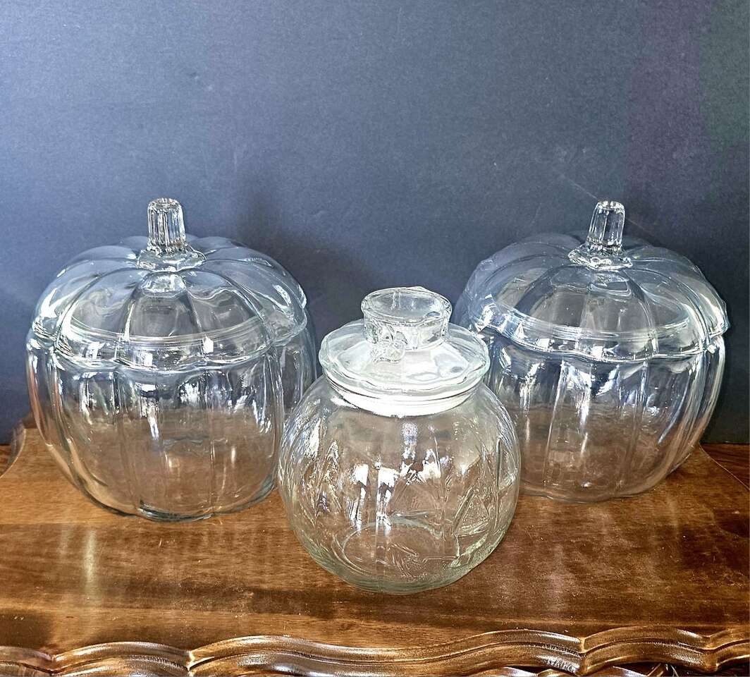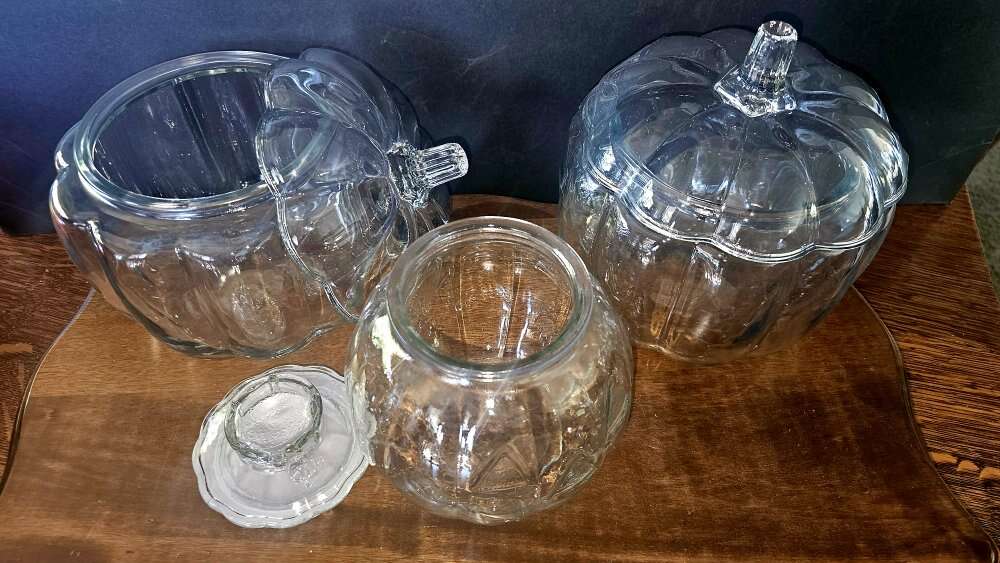 Perfect cute glass pumpkins for Halloween or Thanksgiving. The two large are 7" and have removable glass tops. The medium is 5" with a stop closure and a smiley face front. Set them out with your favorite snack, dip, or fill them with your seasonal decor.