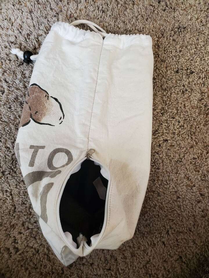 A nice washable bag to store potatoes with a drawstring on top and a zipper opening on the bottom.