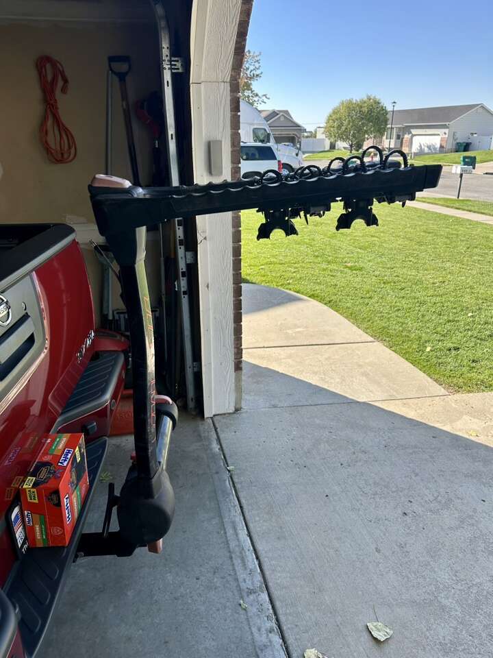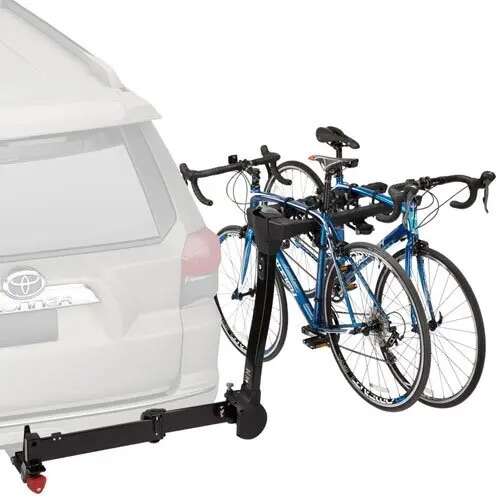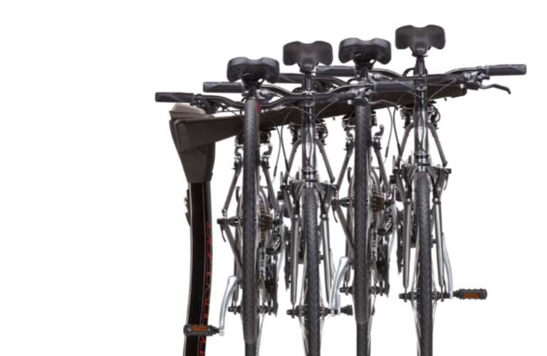 Holds 4 bikes. Up to 40lbs each bike. Bikes hang on their frame. Oversized, heavy e-bikes not recommended. The cradles are adjustable up and down the arms. Swings completely out of the way of your tailgate or trunk. Fits 2” hitch.