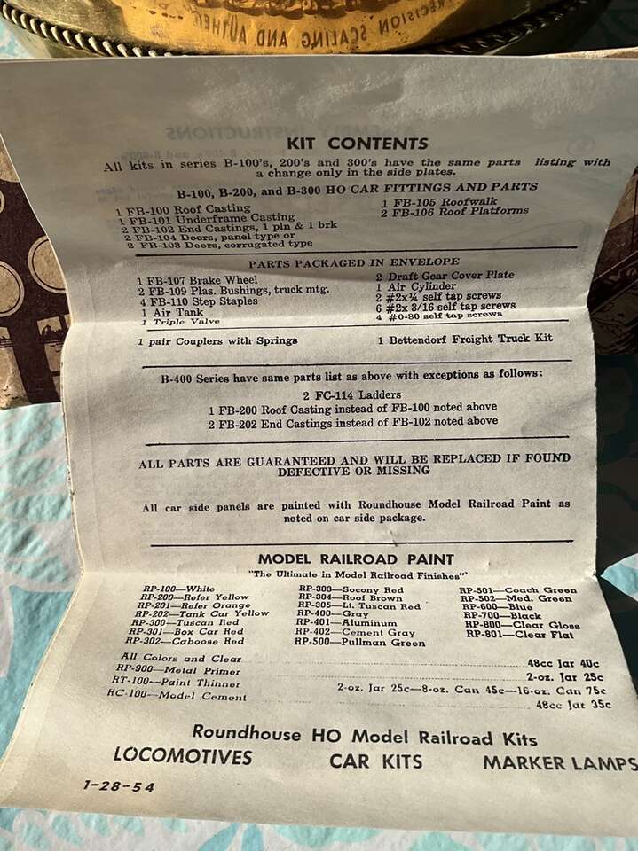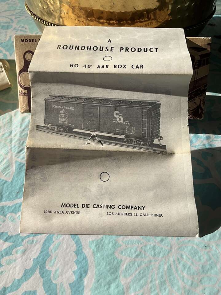 Roundhouse HO 40’ AAR Box Car kit. Literature shows 1954; never assembled. Die cast (zinc?) metallic kit. Complete as far as zinc can tell. Sides painted with “Rock Island” railroad. Cash only.