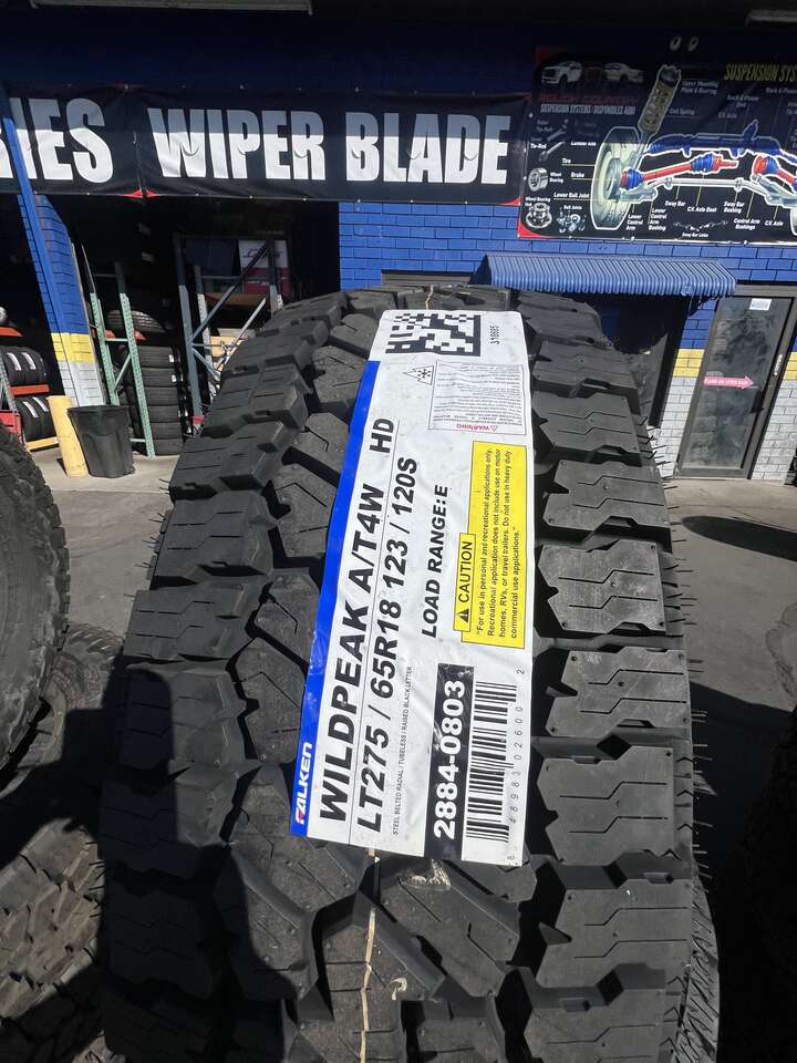 FULL SET OF LT275/65R18 FALKEN WILD PEAK A/T4 10PLY LOAD RANGE E WITH 55K MILES WARRANTY. AWESOME DEAL. ASKING PRICE OF $1348.00 OUT THE DOOR PRICE. TAXES, BALANCE, MOUNTED & INSTALLED INCLUDES. HABLAMOS ESPANOL. WE CARRY OVER 200 SIZES AND CAN GET ANY MAJOR BRAND TIRES! WE ARE ALSO DOING ALIGNMENTS, BRAKES AND SHOCKS AND OTHERS SERVICES. WE HAVE FINANCING OPTIONS AVAILABLE. NO CREDIT CHECK!!! WE ARE LOCATED IN 399 S. STATE ST. OREM. UT. 84058. ( 801) 691-0675