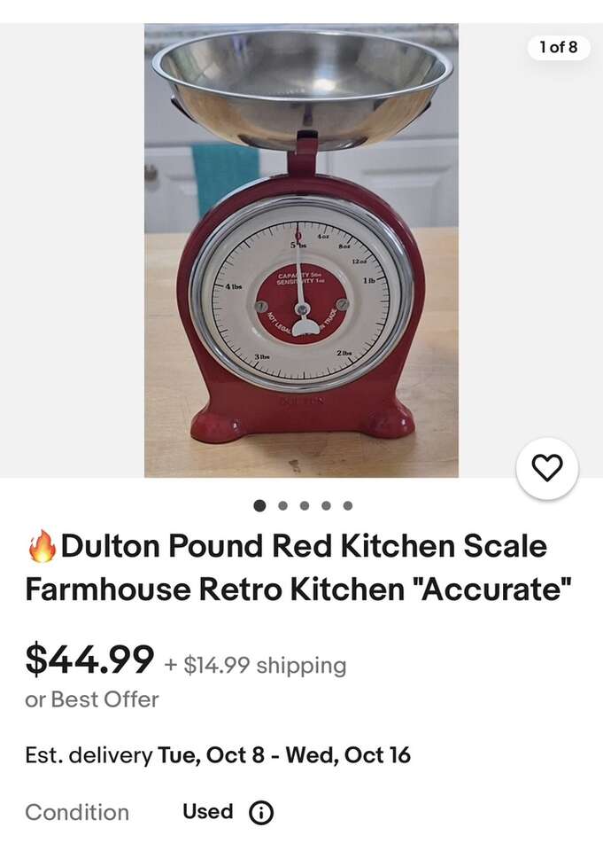 This red retro/vintage kitchen scale is in great shape and measures accurately. Dimensions are 9 inches by 6.5 inches. Average online price is $45 plus tax and shipping I’m asking $20 or best offer. Text preferred or leave a voicemail and I’ll get back to you.
