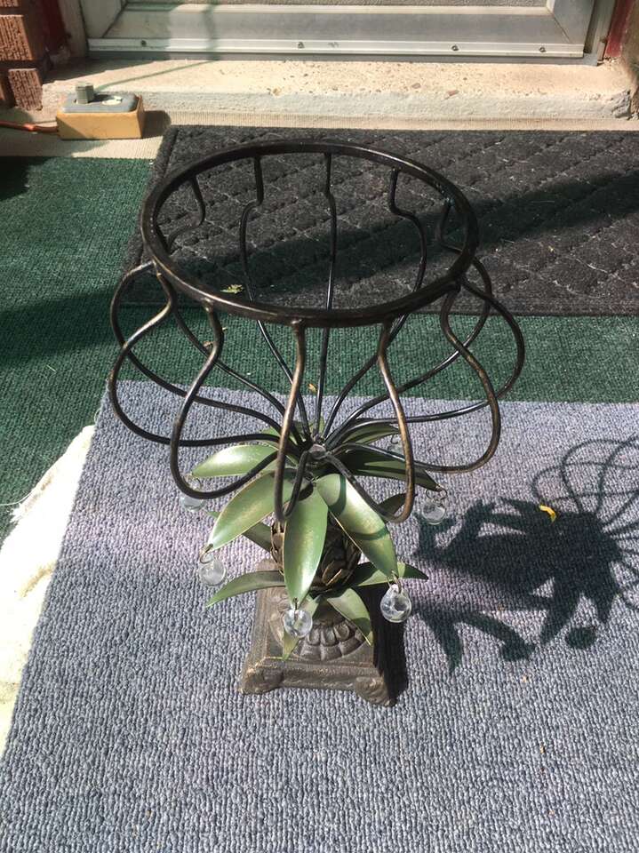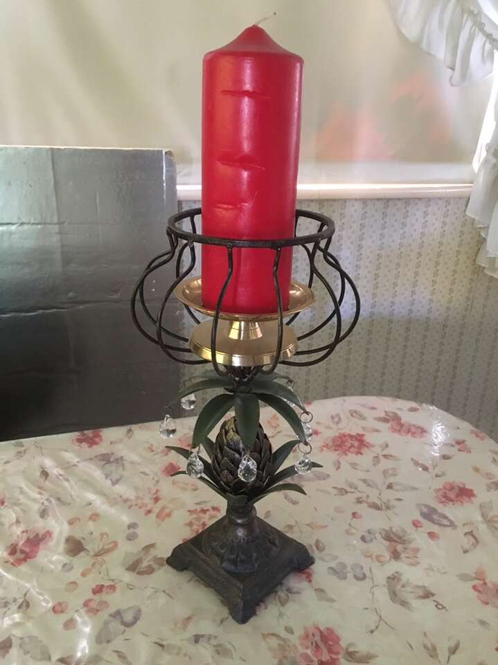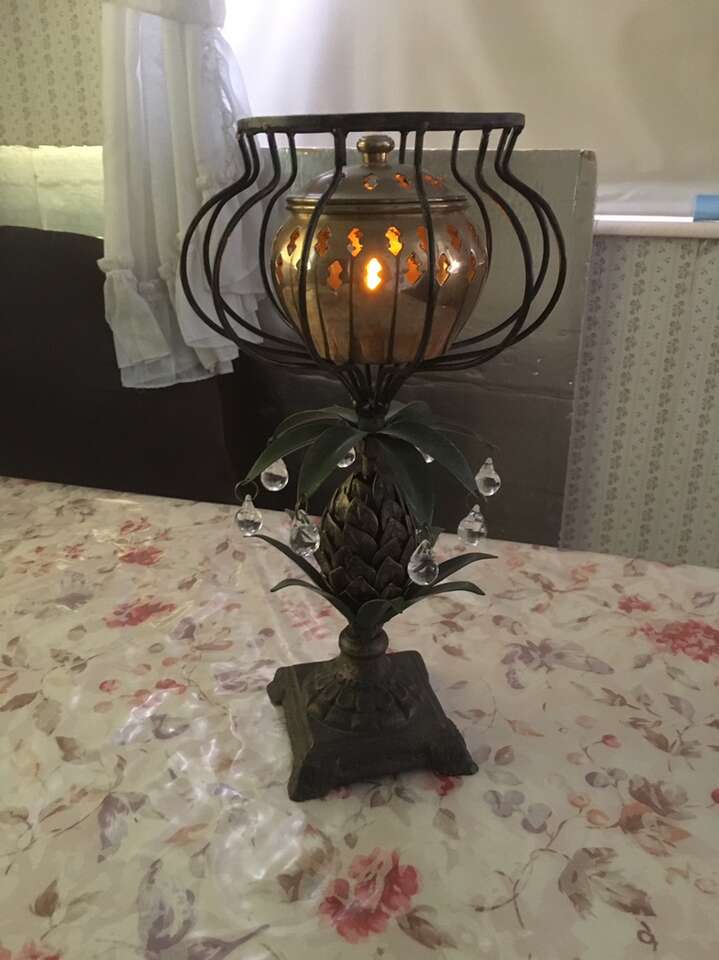 Very unique item in excellent condition. Pineapple motif. It stands 13 inches high the base is 4 x 4” and the basket part is 7 inches wide. Quite heavy. The last two pictures are for illustration of how it can be used candles are not included.