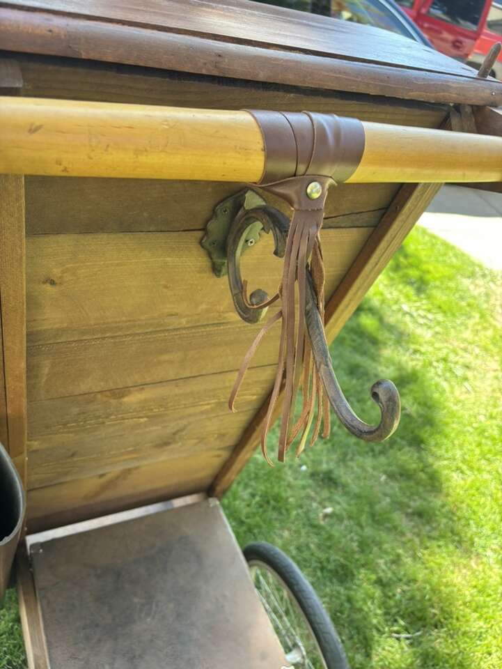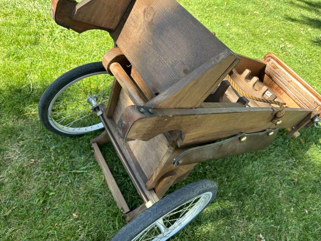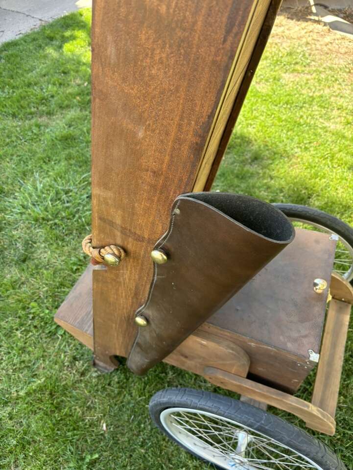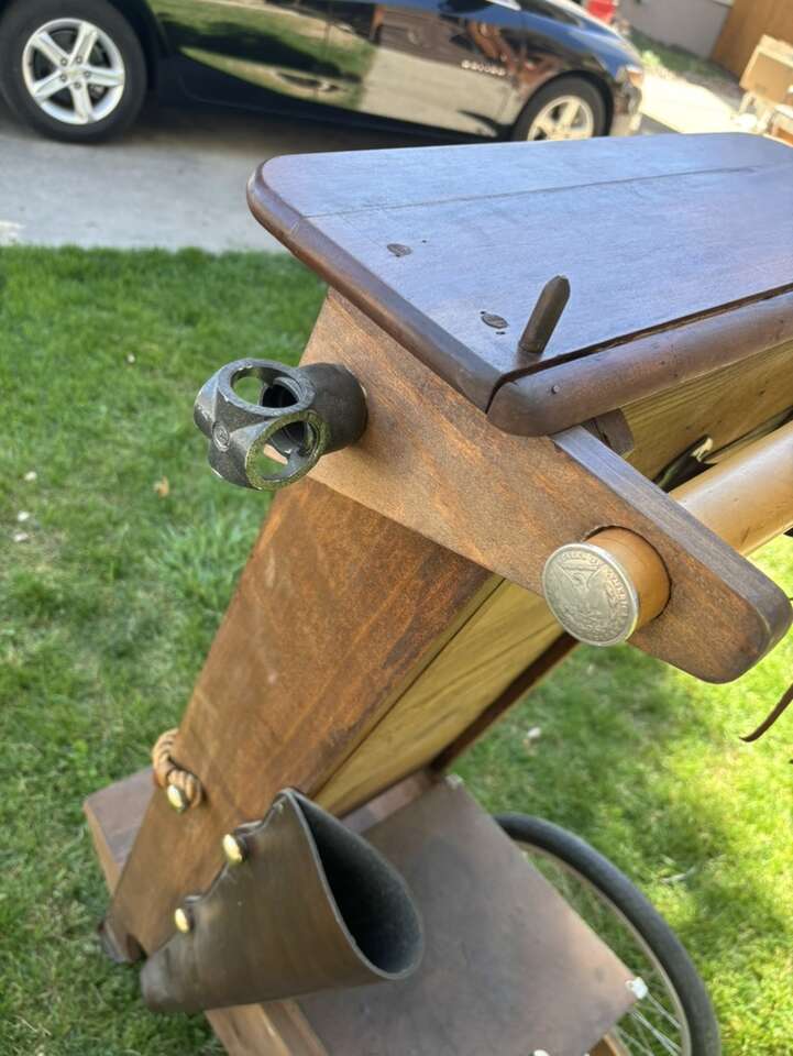 VERY NICE AND UNIQUE LOOKING MADE OF WOOD, LEATHER AND SOME CAST IRON Overall in good condition with some tear and wear.