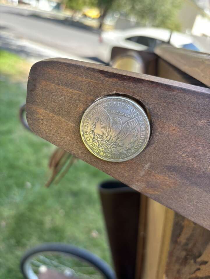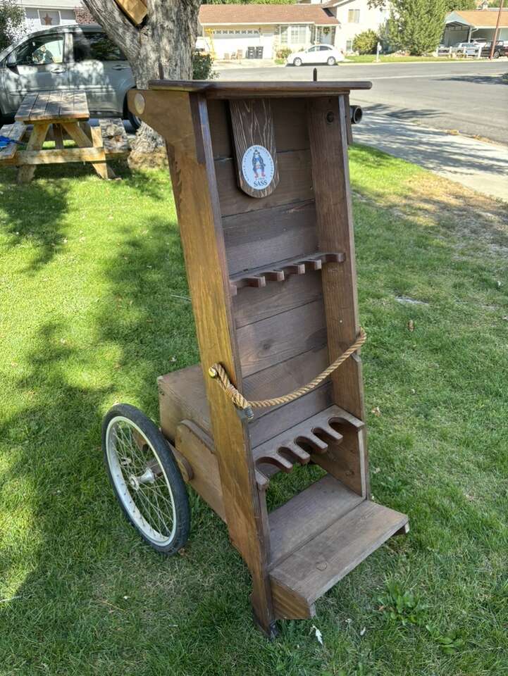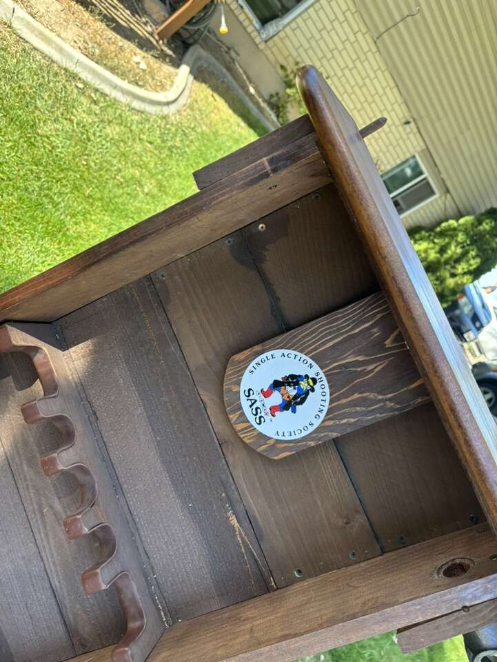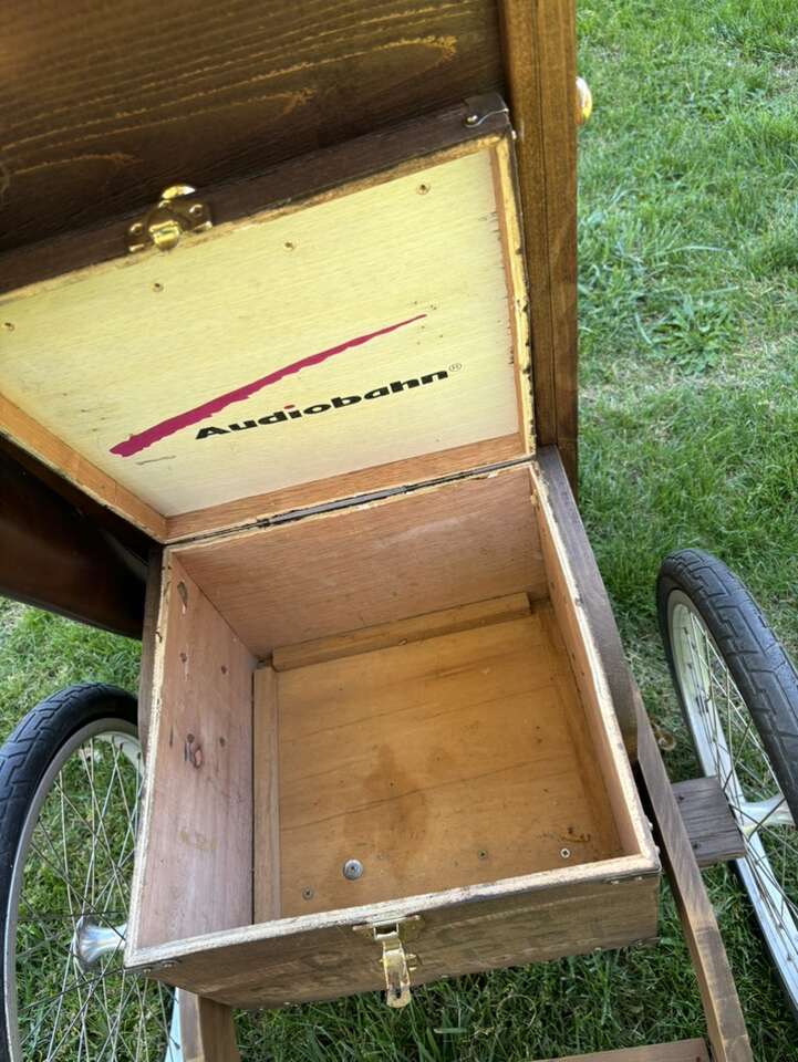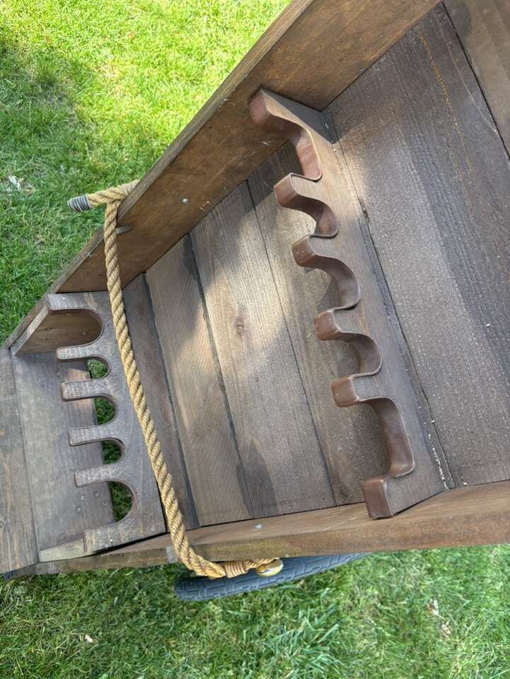 VERY NICE AND UNIQUE LOOKING MADE OF WOOD, LEATHER AND SOME CAST IRON Overall in good condition with some tear and wear.