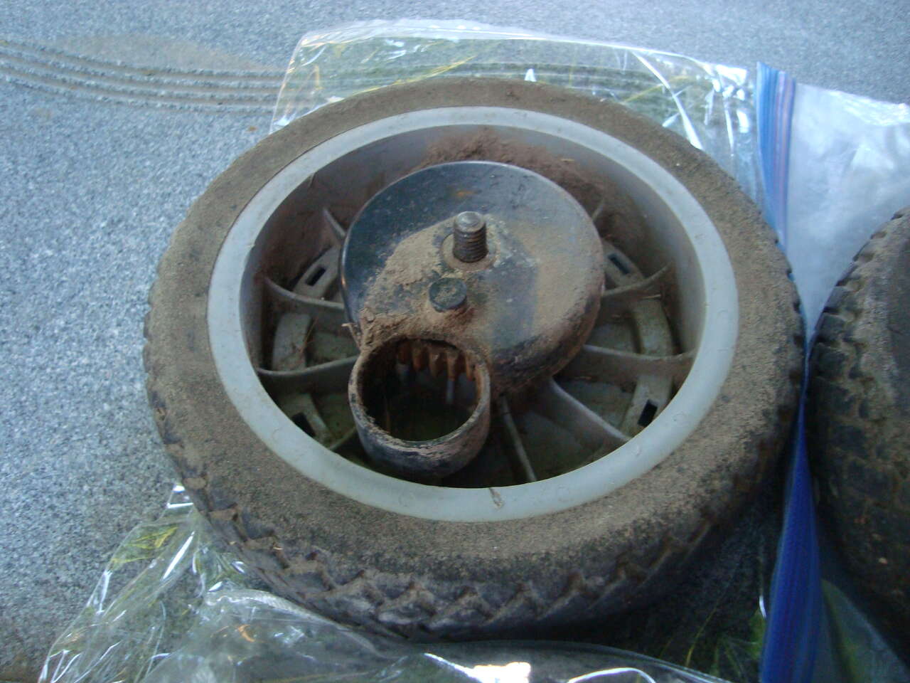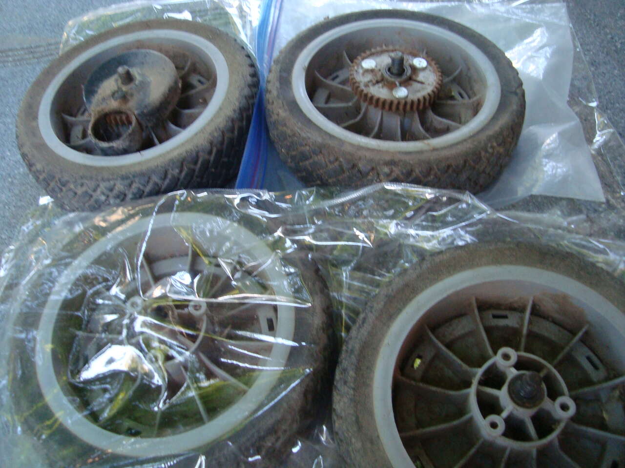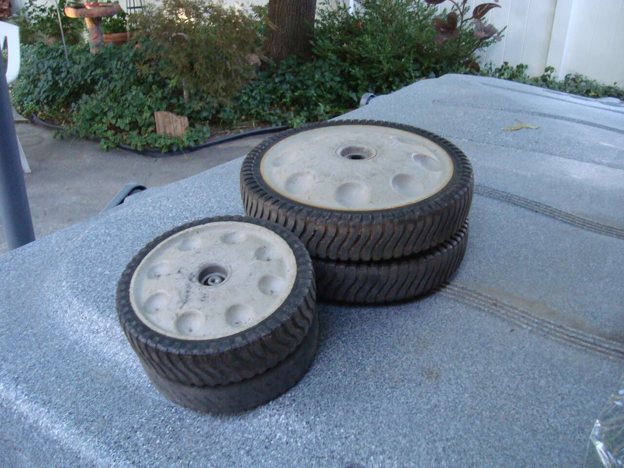 I have 2 full sets of 4 lawnmower wheels. The set not in plastic are Self Propelled. The set in plastic are for a Push Mower. They all have good tread on them. Asking $25. for each set. Cash only No Venmo.