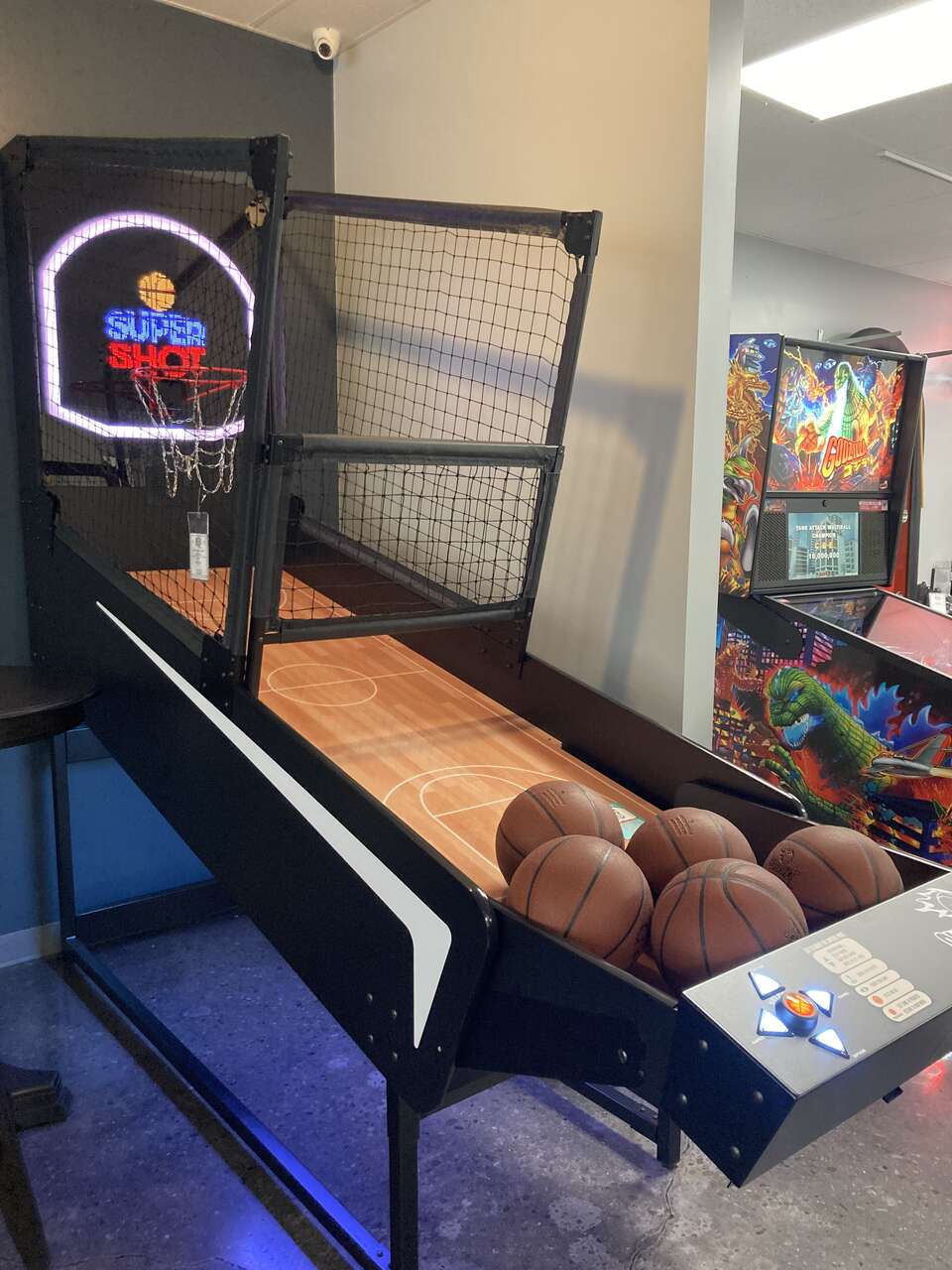 Superhshot Home Arcade by Skeeball Premium in-home basketball game. Featuring adjustable height and length, Led lit backboard, 8 + games for up to 8 players. Deisgned with aestethetic in mind and built in the heart of the Midwest! Come see us to perfect that jump shot!