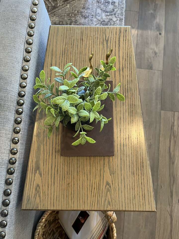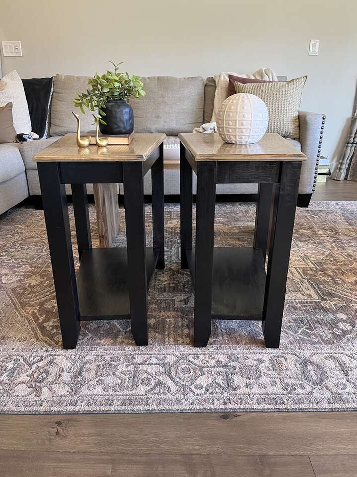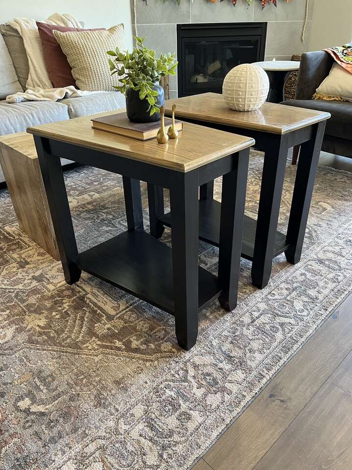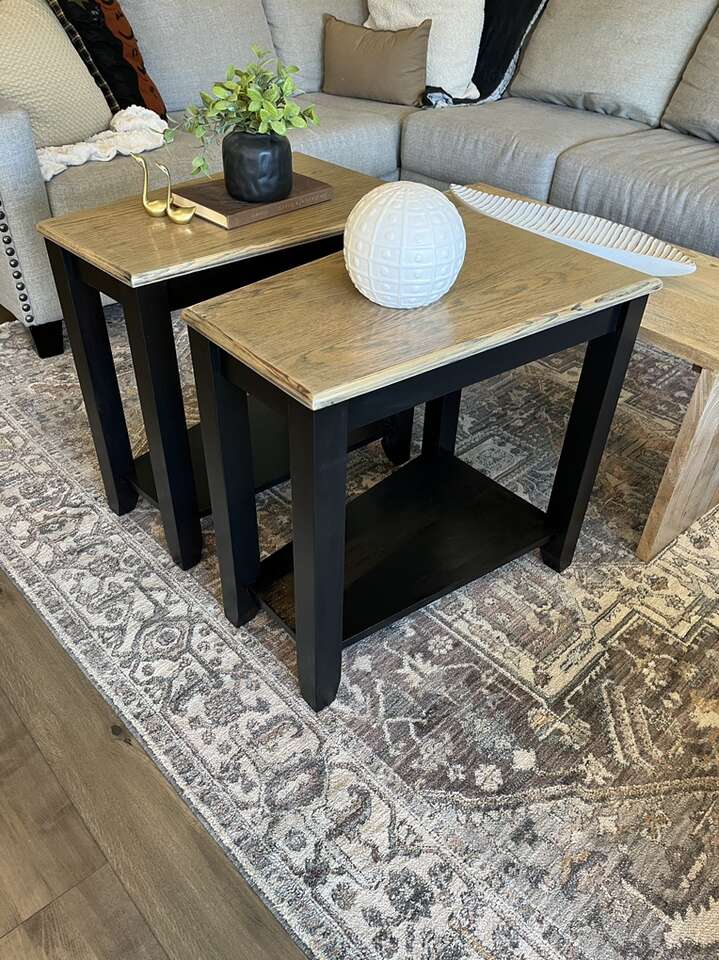 Oak sofa wedge between chairs accent tables Top stained a warm brown and painted black Shelf on bottom