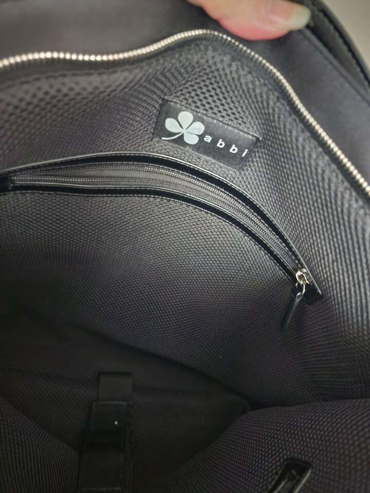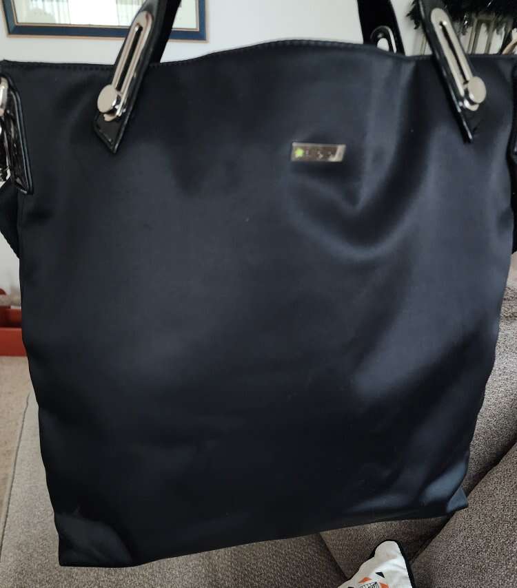Black Satin, adjustable shoulder strap, 2 inside pockets and strap to secure laptop or files. 16" L x 3" W x 17" H