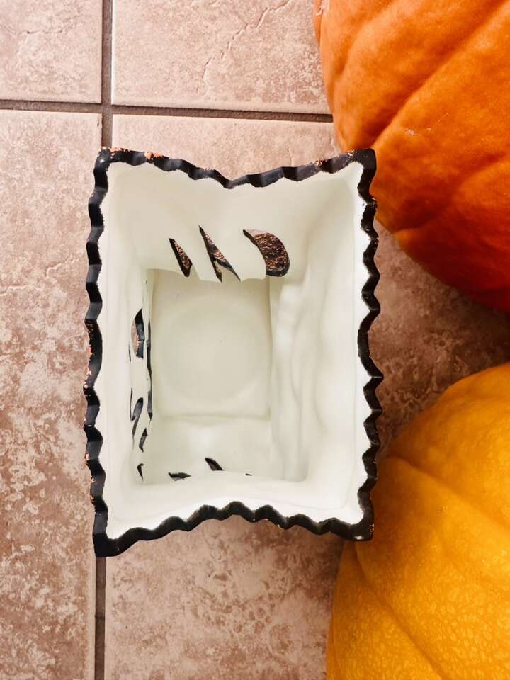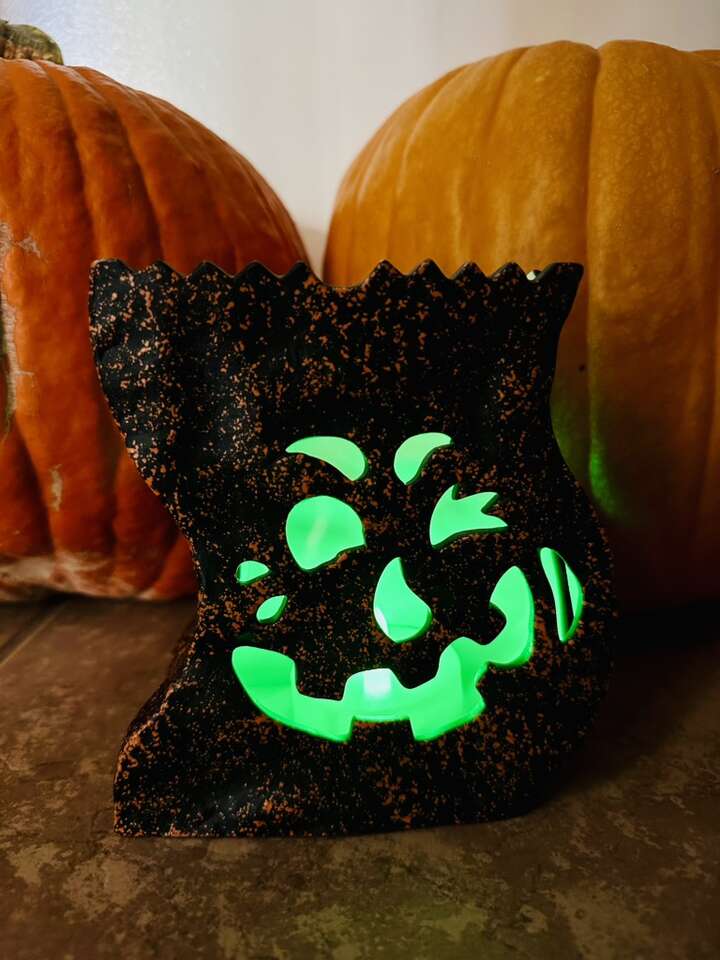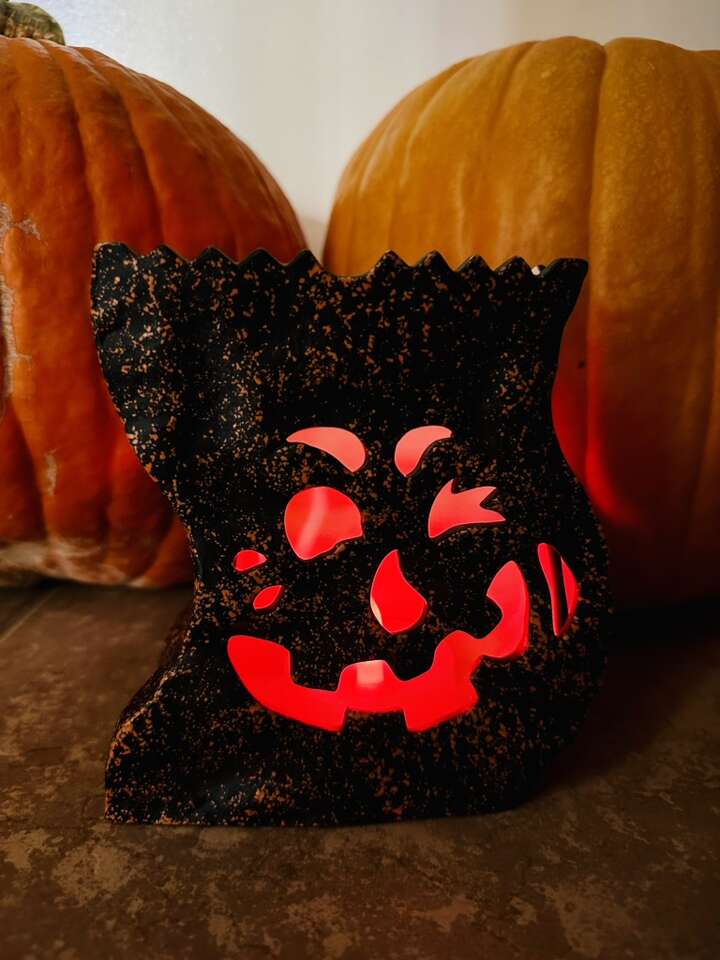 Vintage Partylite Halloween Jack O lantern pumpkin candle luminaire. Shaped like a paper bag, and made of ceramic. No visible chips or damage. Includes color changing battery powered candle inside. Located in Layton