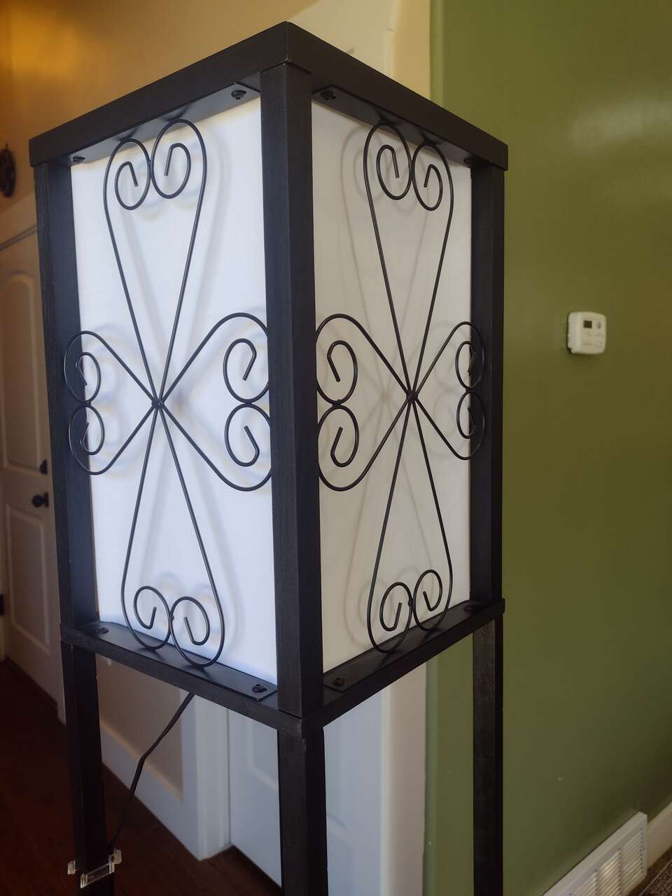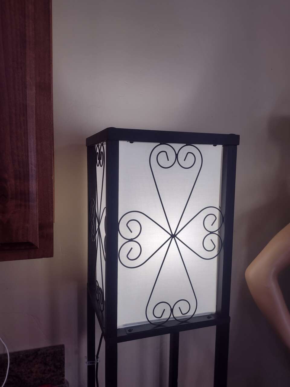 This lamp is like new, in excellent condition and is also an eight bottle wine rack, with slots to hang stemmed glasses as well. Pull chain for turning on/off the light. Lamp is 62" tall and 10" deep/square. $60
